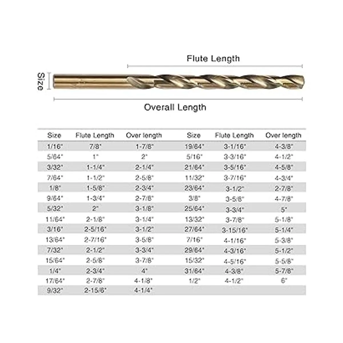 El juego incluye: 1/16, 5/64, 3/32, 7/64, 1/8, 9/64, 5/32, 11/64, 3/16, 13/64, 7/32, 15/64, 1/4, 17/64, 9/32, 19/64, 5/16, 21/64. , 11/3 2, 23/64, 3/8, 25/64, 13/32, 27/64, 7/16, 29/64, 15/32, 31/64 y 1/2 pulgadas; viene en caja de almacenamiento indexada de metal para un fácil almacenamiento