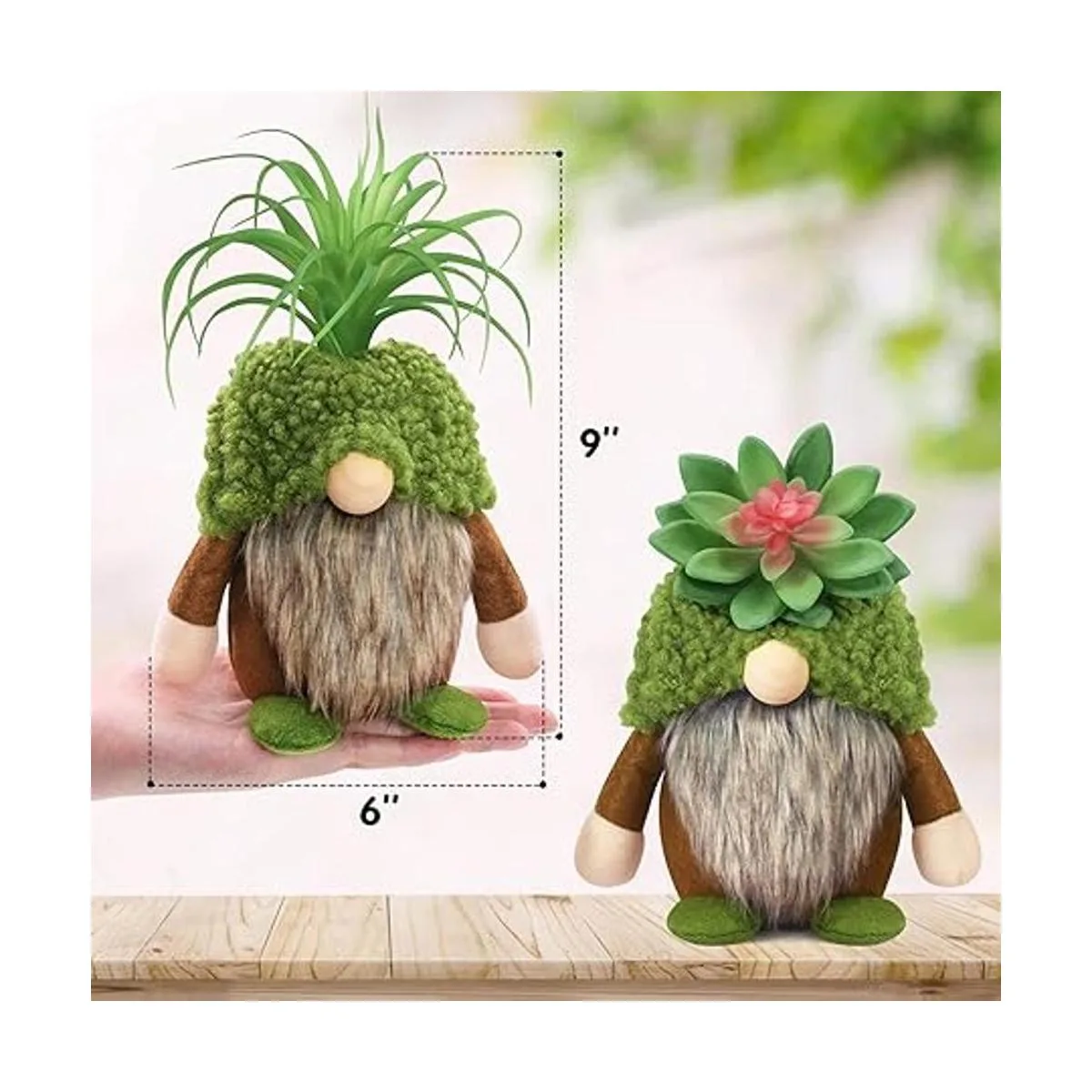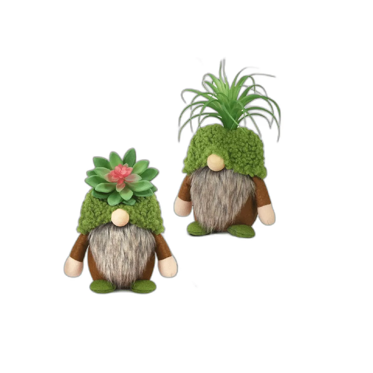 Gnomos con plantas de aire llamativas y hojas carnosas: un enano tenía un tallo grueso carnoso deja plantas suculentas en su cabeza, y el otro era una planta de aire delgada que parecía ser plantada en musgo. Perfecto para sentarse en alféizares de ventanas, escritorios, mesas, estanterías, chimeneas, jardines, escritorios y mucho más.