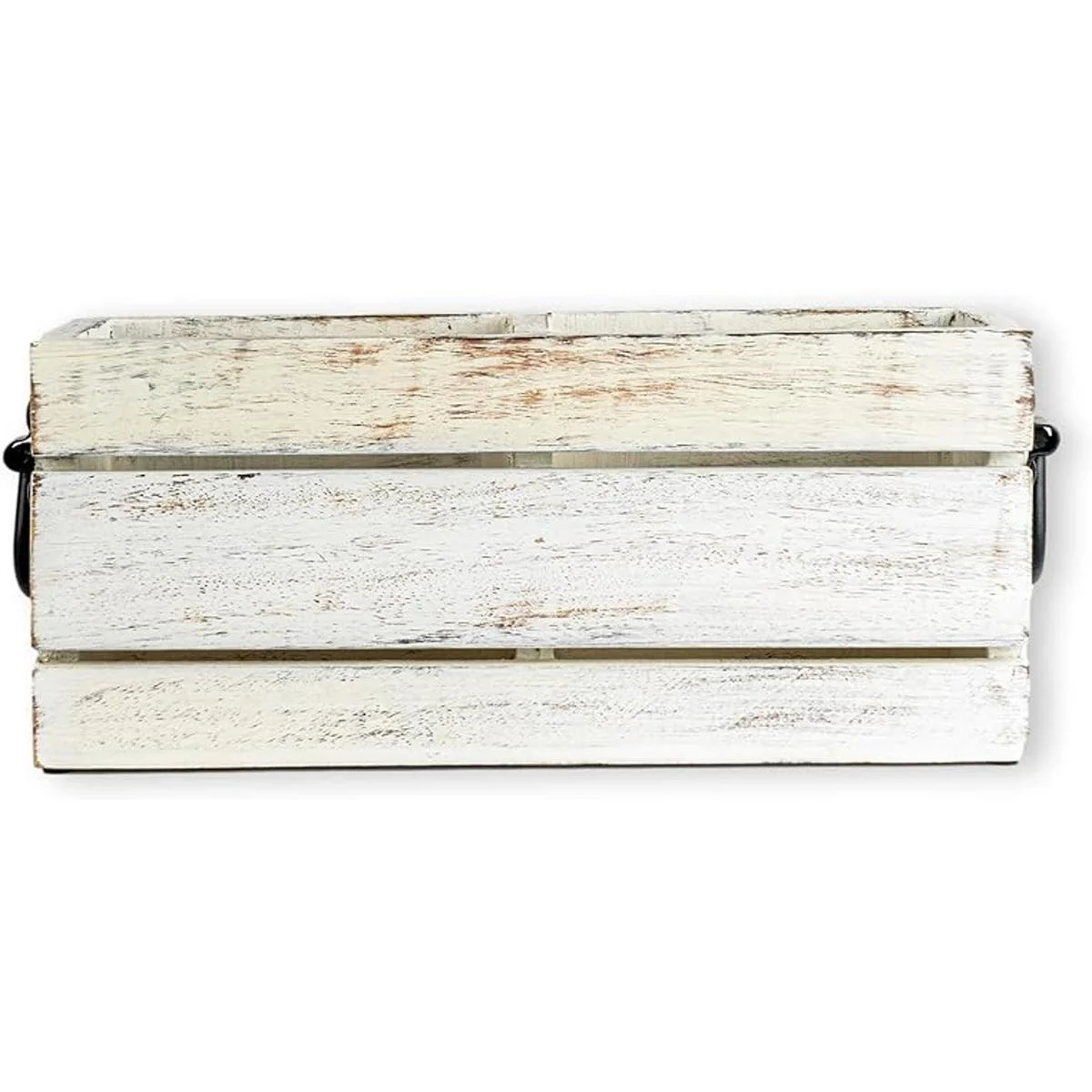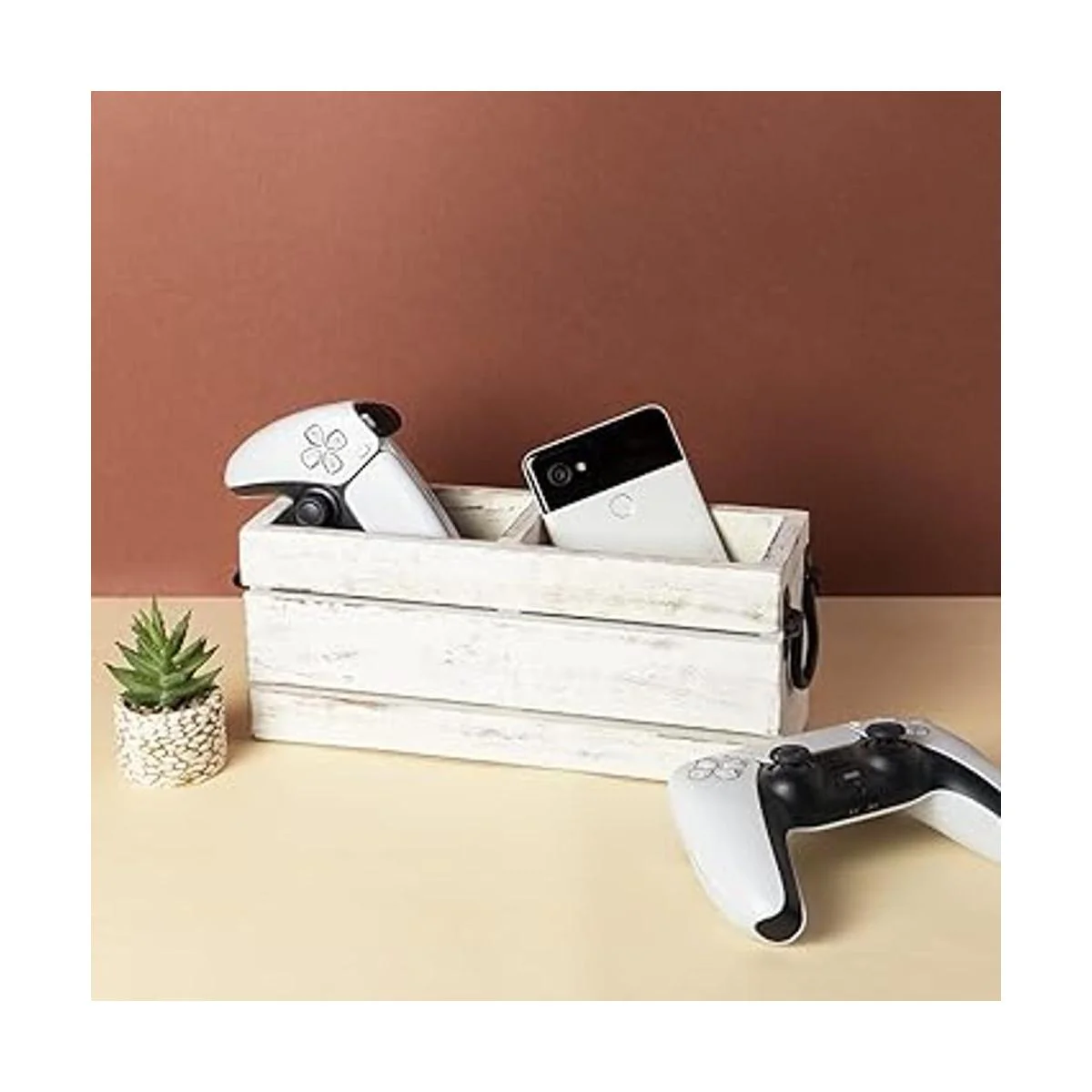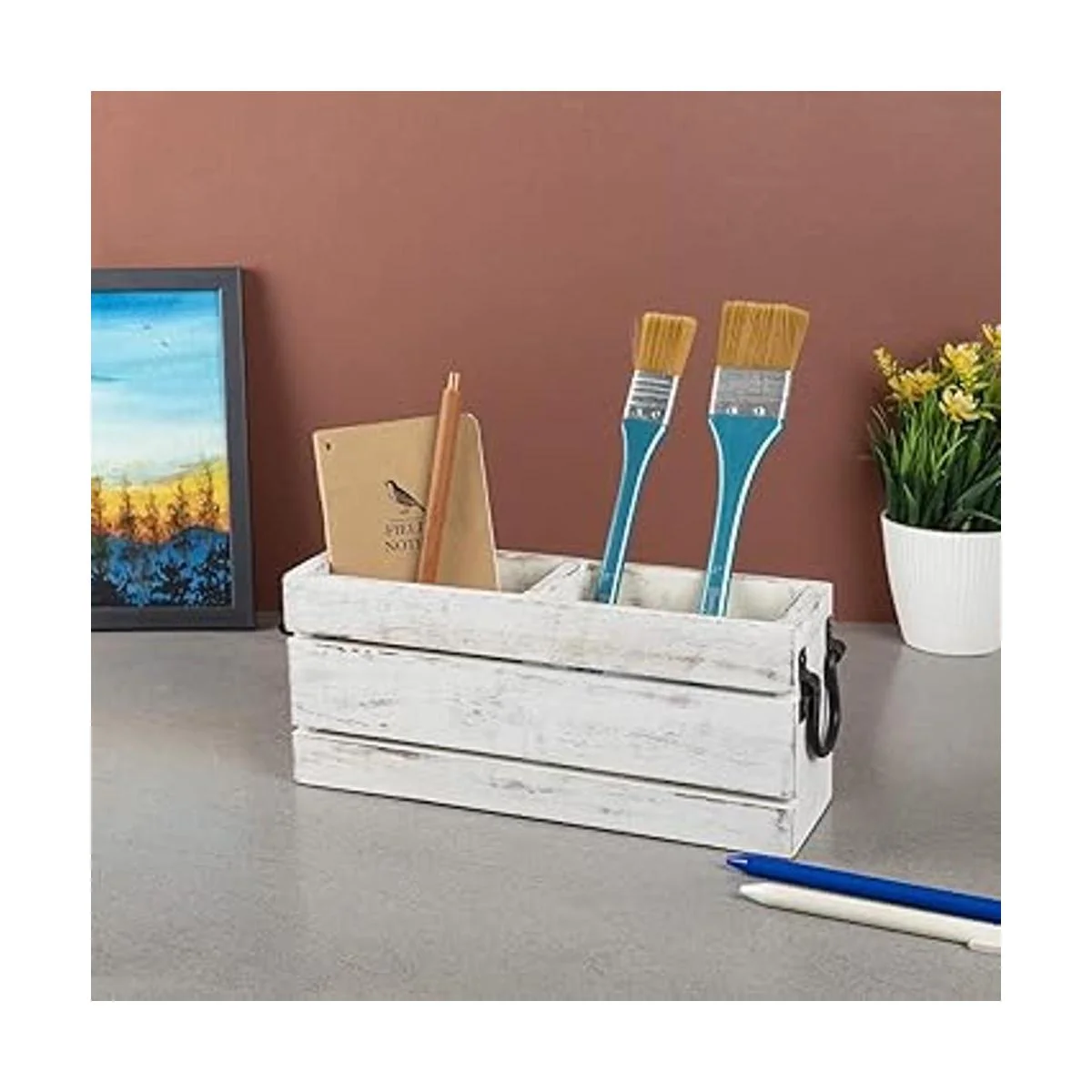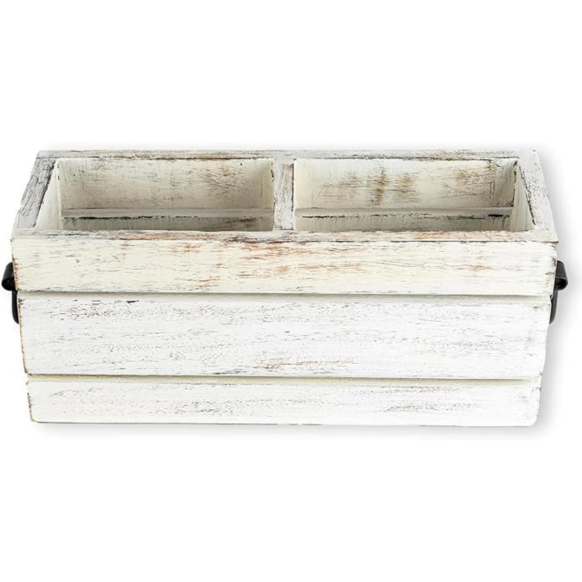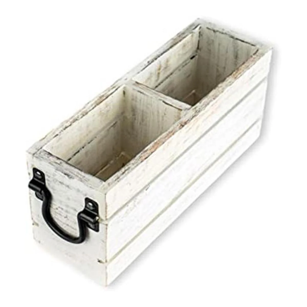 GoCraft Organizador de 2 compartimentos para cubiertos, organizador de escritorio multiusos para escritorio, mandos a distancia, suministros de oficina, bolígrafos, lápices, brochas de maquillaje, tocador, mesita de noche, acabado blanco rústico con asas de metal