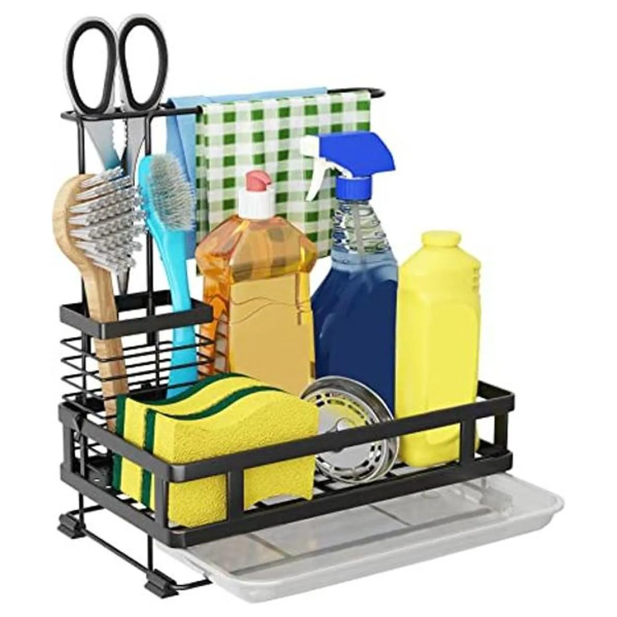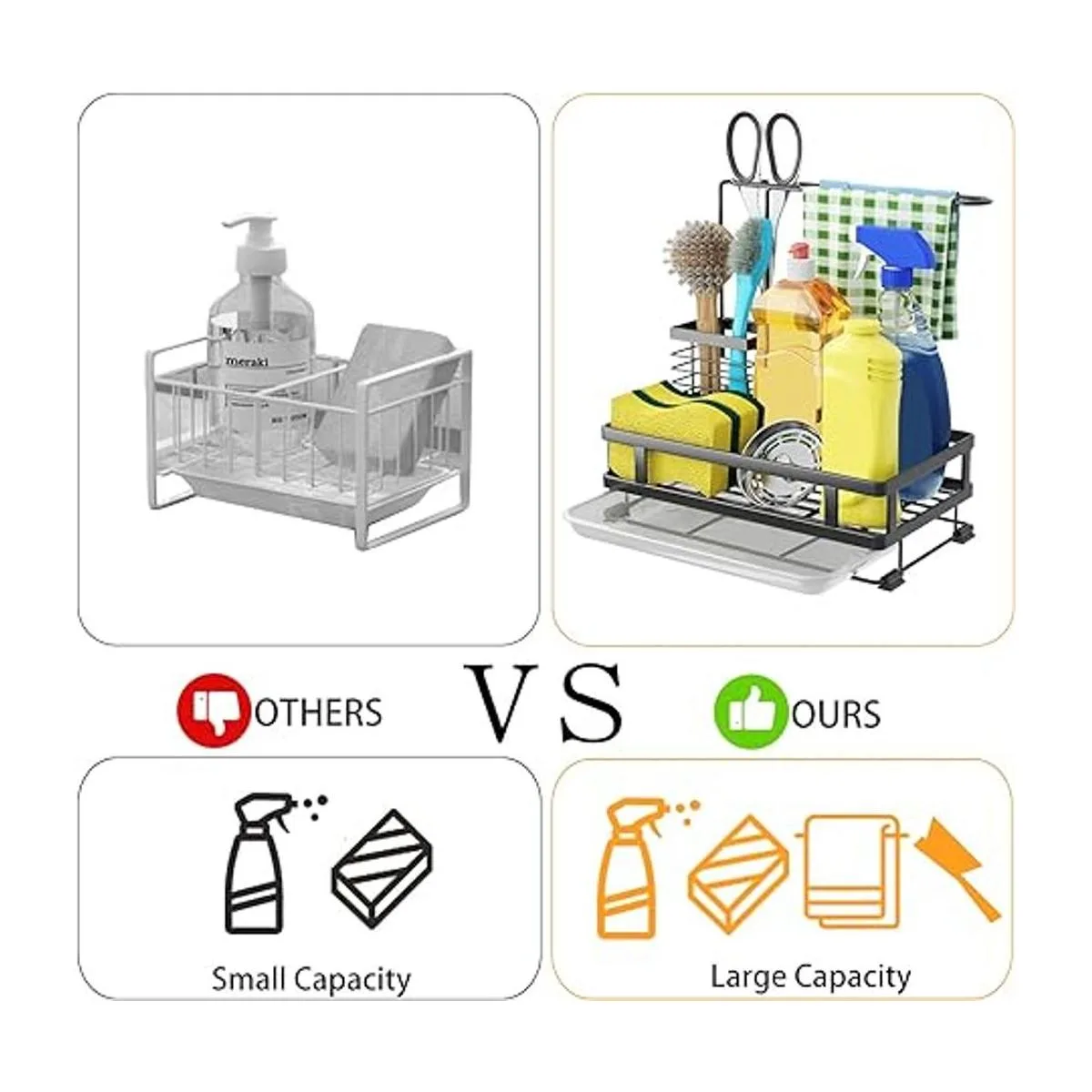 Quick Dry Design The Kitchen Sink Organizer is Equipped with a Removable Plastic Drip Rray, Water All Falls to the Tray Underneath Which is Easy to Pull Out, Drain and Rinse.The Bottom of the Sink Organizer is Hollowed Out and the Ventilation Holes are Evenly Distributed, the Water Drains Quickly and Easily.