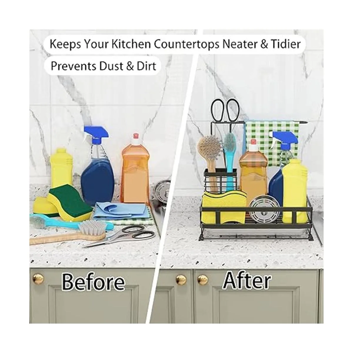 Powerful Sponge Storage Holder Our Sponge Storage Holder Provides More Space for Your Cleaning Accessories Than Others. Measuring 10.5 L X 5.9 W X 10.5 H, Its Perfect for Holding Sponges, Soap Dispensers, Brushes, Sink Plugs, Dish Soap, Hand Soap Bottles, Scissors, Rags and More.Makes Your Living Environment Cleaner and Tidier.