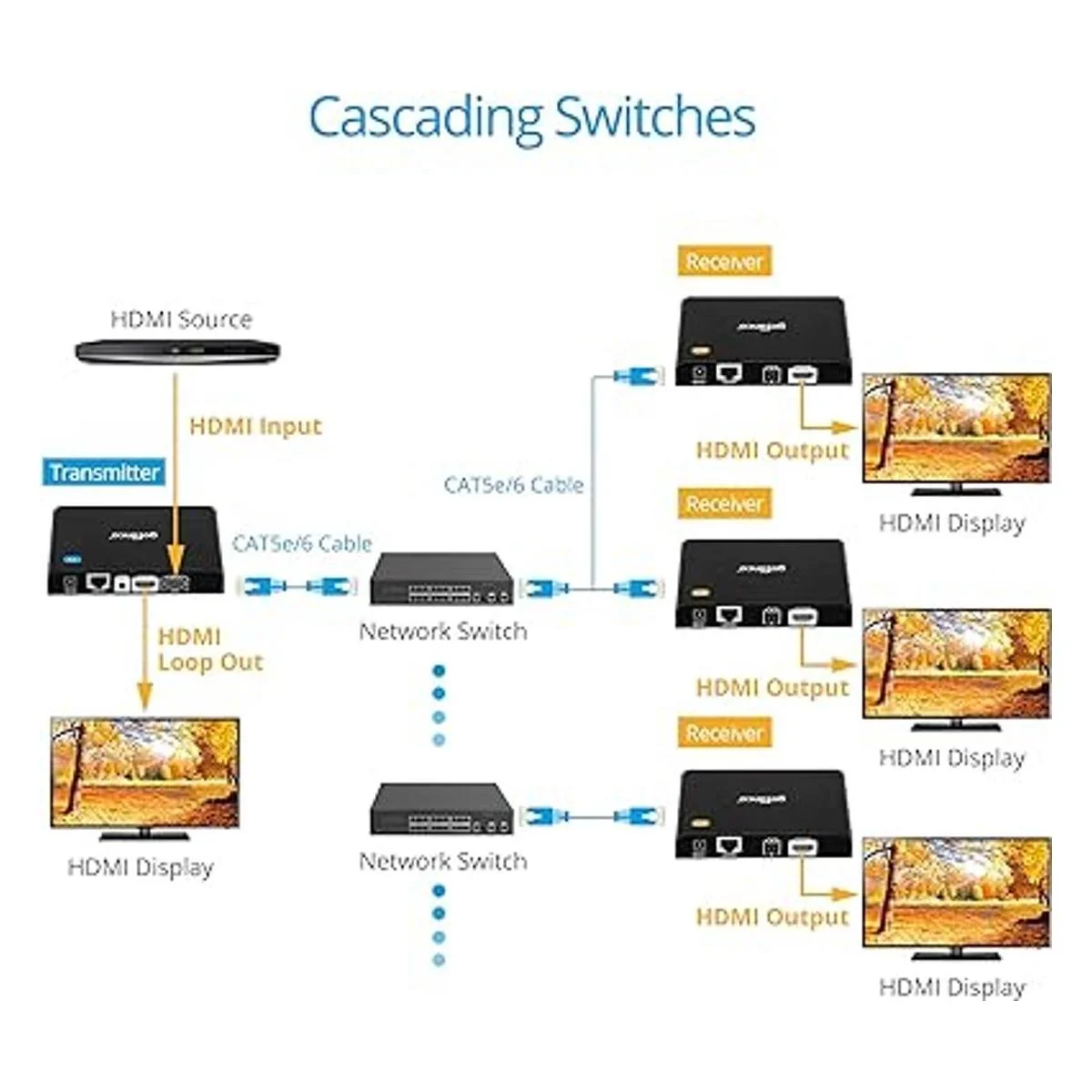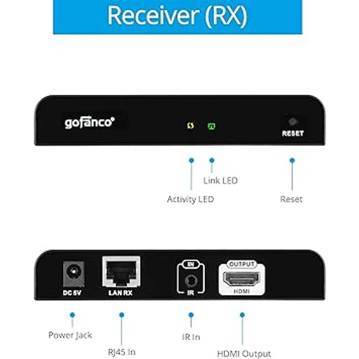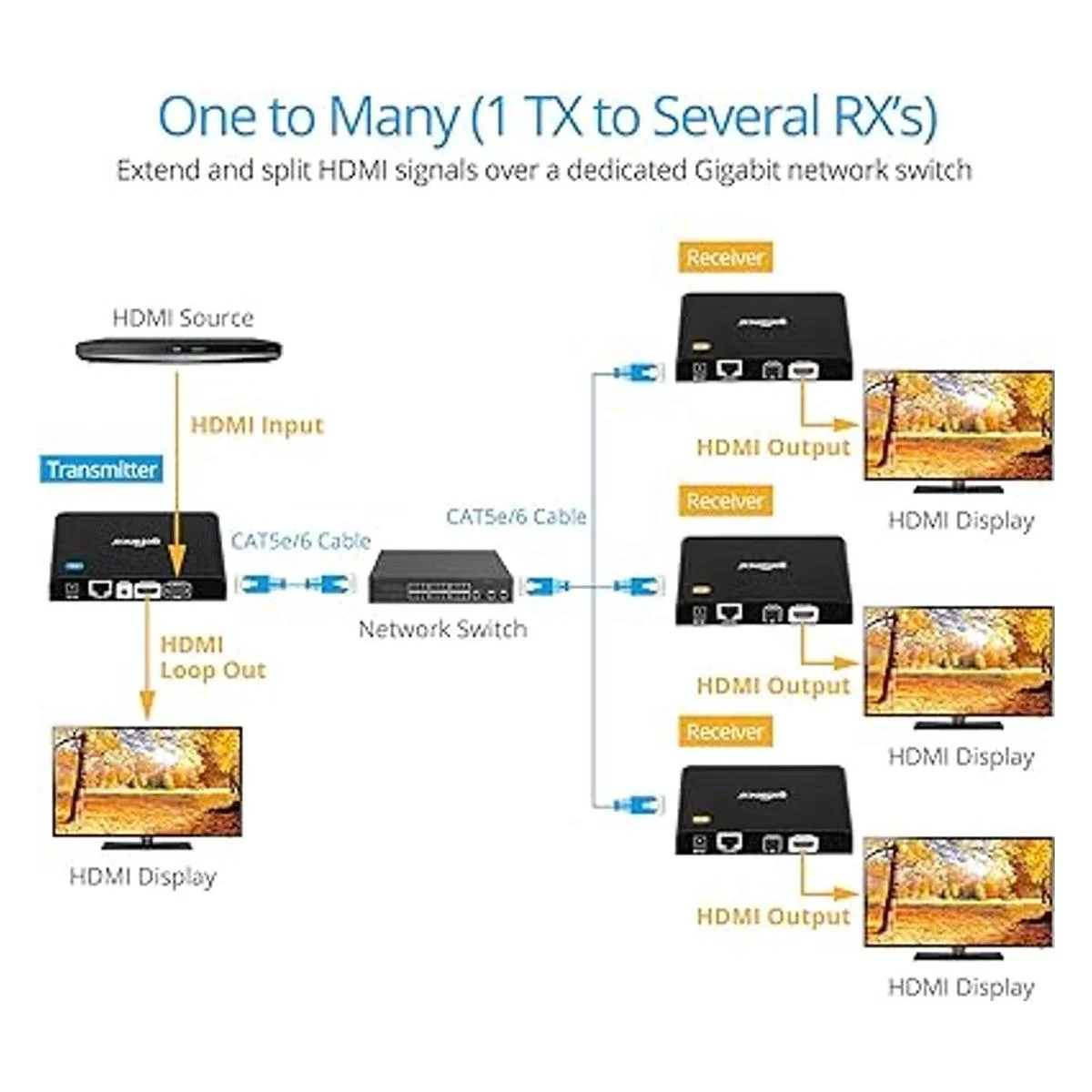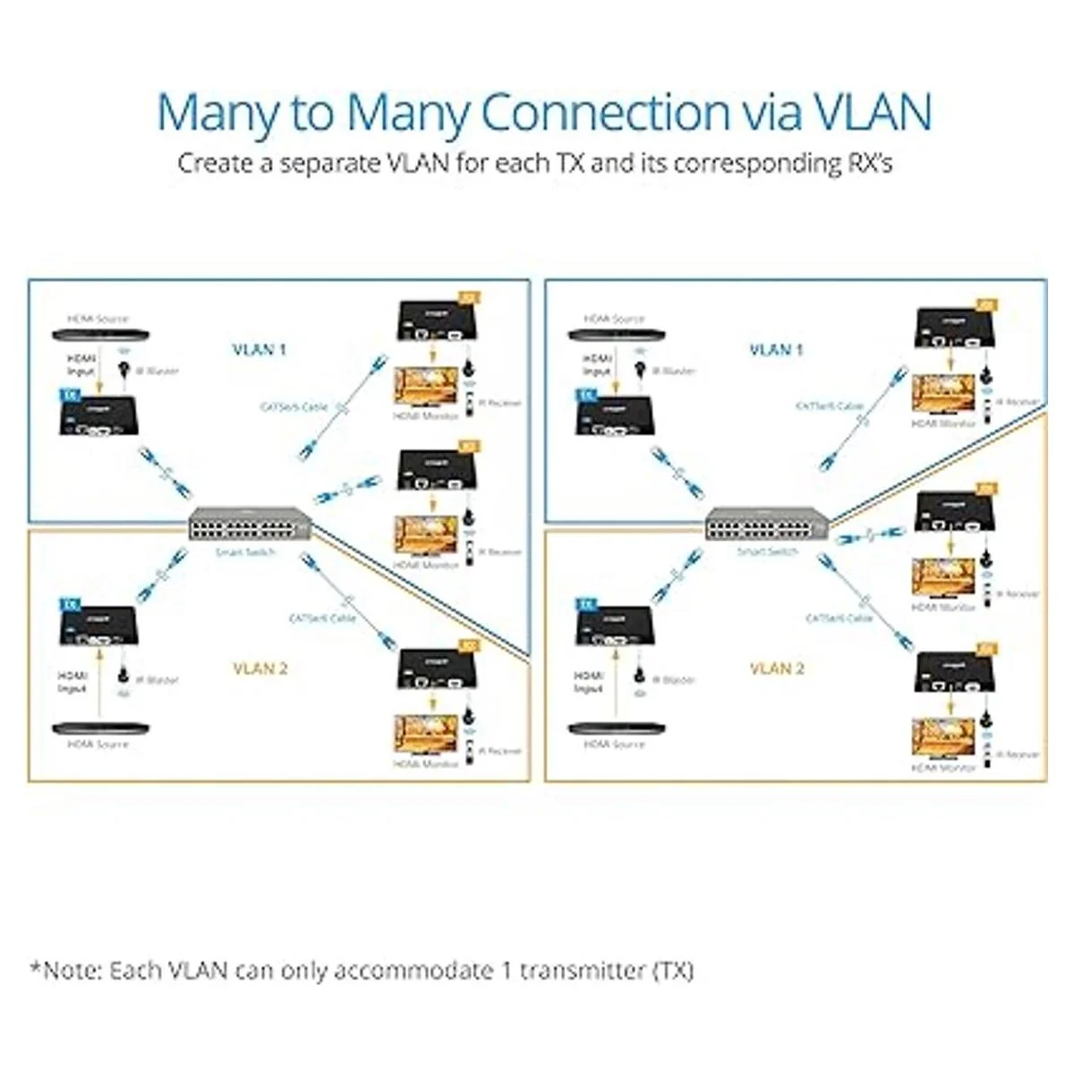 NETWORK DISTRIBUTION Connect up to 30 receivers per transmitter. Direct 1to1 connection, 1tomany configuration through 1 Unmanaged/Dedicated Gigabit switches, 2 Smart Gigabit switches with VLAN to segregate video traffic from the rest of the LAN. Manytomany configuration is also supported via VLAN setups. Note that each VLAN can only accommodate 1 transmitter TX. We recommend gofanco 24port video Ethernet switch EthSwitch24P2, B085DD9GG4 ; Dont use home routers for this