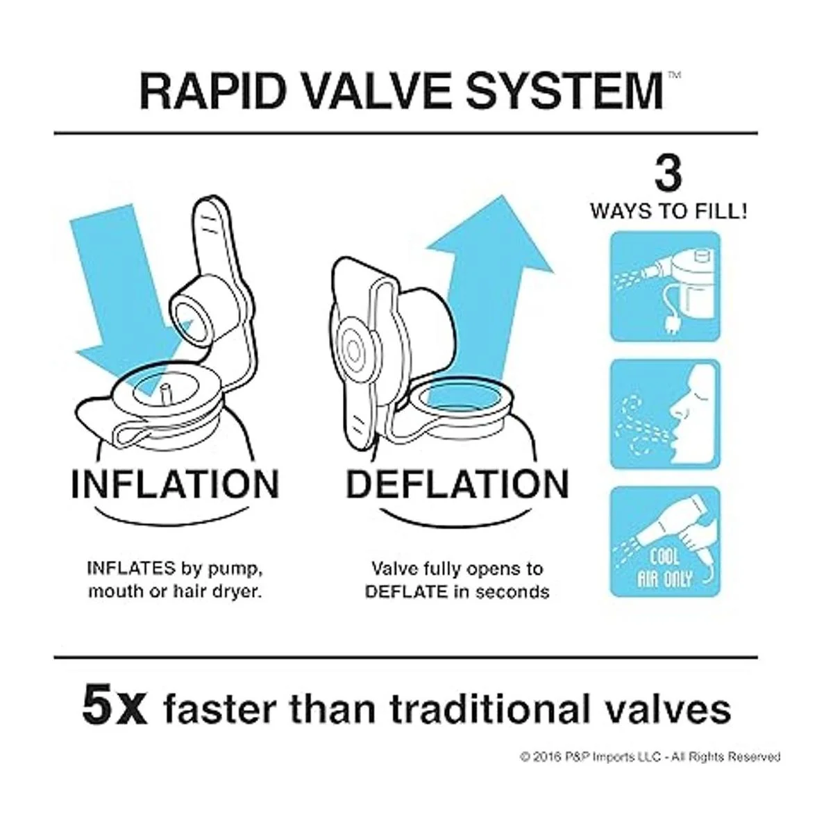 Inflado rápido de la válvula: la nueva válvula rápida permite un inflado y desinflado 10 veces más rápido en comparación con las válvulas tradicionales 2 minutos frente a 20 minutos