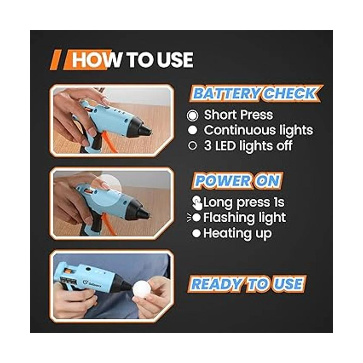 Batería integrada de larga duración de 5 Ah: nuestra de pegamento inalámbrica recargable con soporte funciona con batería de iones de litio de 5 Ah y solo tarda 2 horas en cargarse completamente. Soporta hasta 180 minutos de trabajo después de la carga completa. Los indicadores de alimentación LED en la parte superior de esta de pegamento caliente inalámbrica te ayudan a comprobar la energía restante de la batería en cualquier momento. Carga con cable USBC.