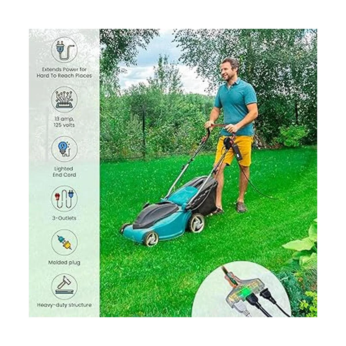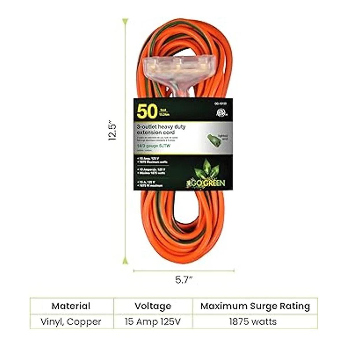 GoGreen Power GG15150 Cable de extensión SJTW de 3 tomas de corriente resistente, extremo iluminado, 50 pies