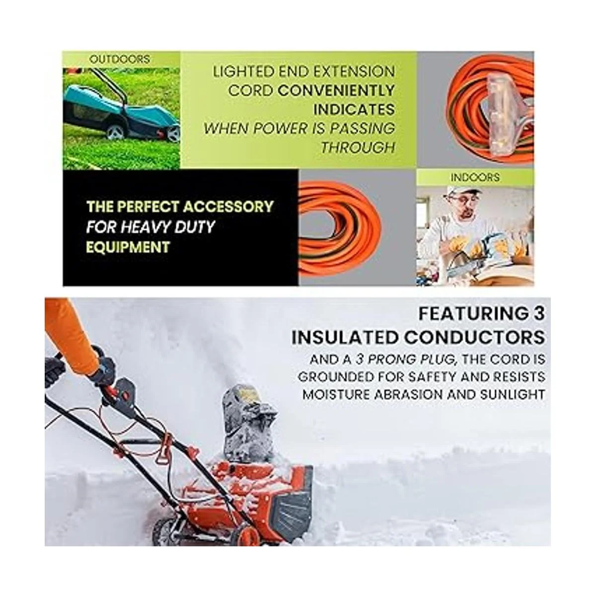 Cable de extensión iluminado: el cable de extensión exterior tiene un extremo iluminado que muestra que la alimentación está encendida. El cable se recomienda para su uso con equipos y herramientas resistentes con un máximo de 15 amperios, 1875 vatios.