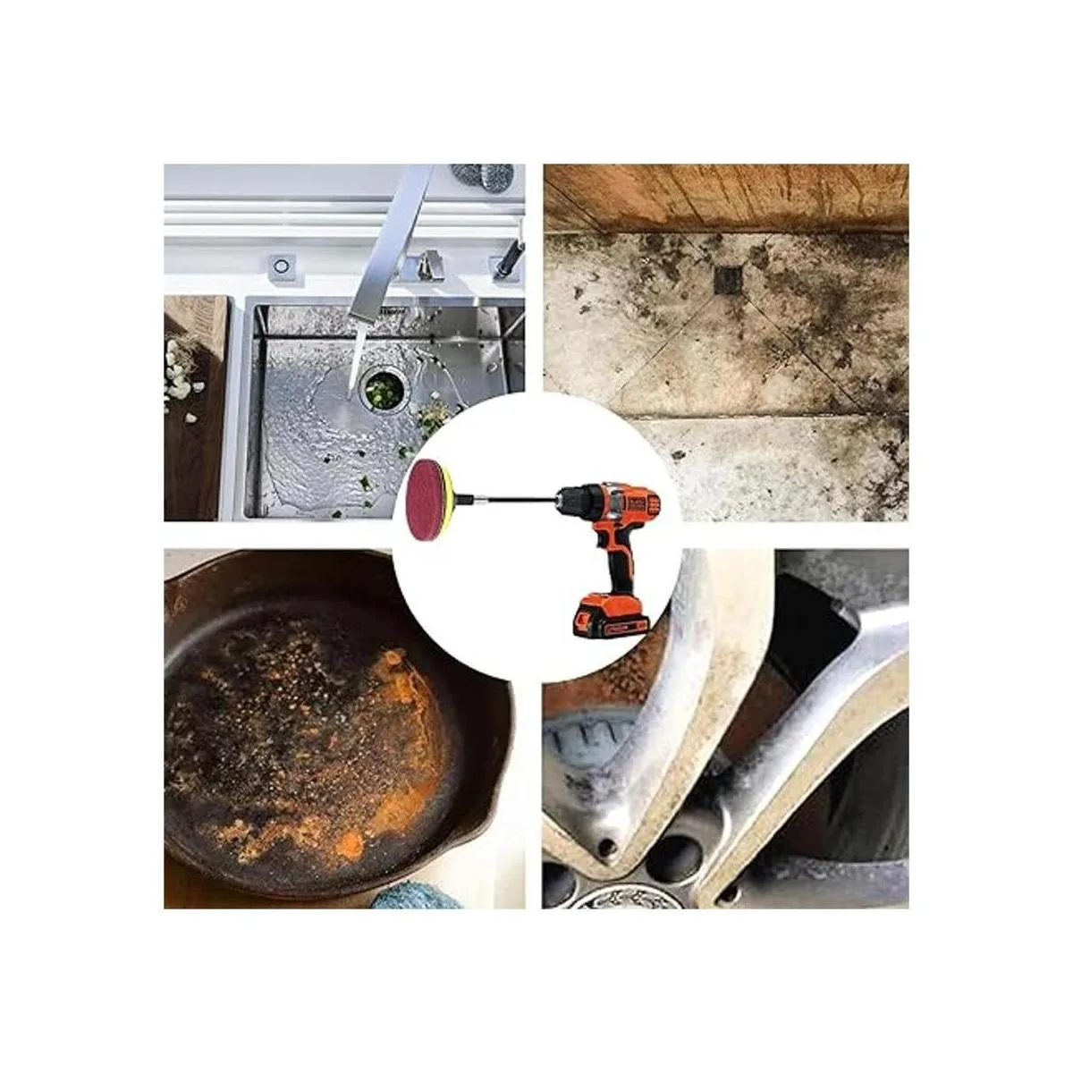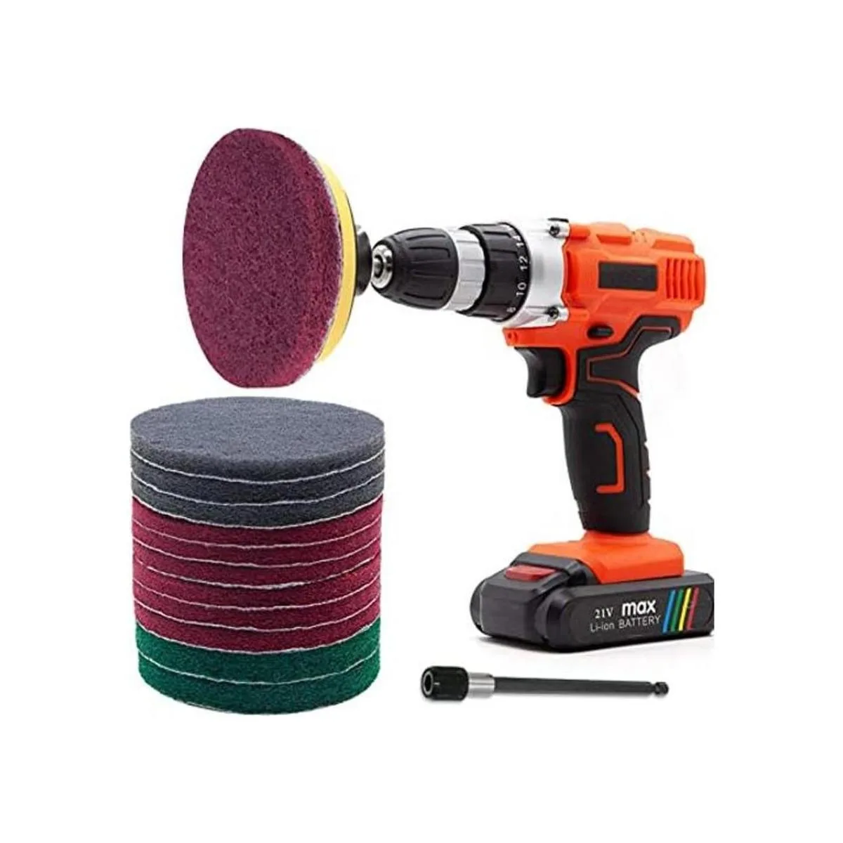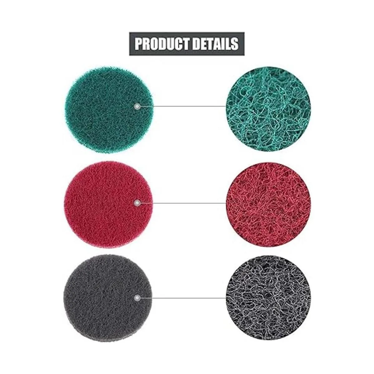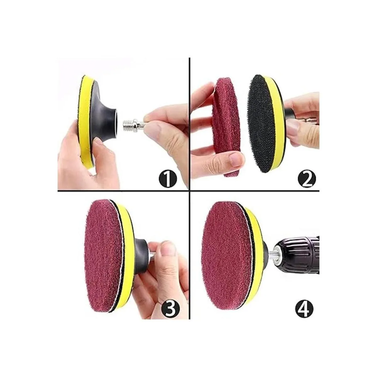 15 almohadillas para fregar piezas: incluye 7 almohadillas rojas de 5 pulgadas, 3 almohadillas grises de 5 pulgadas y 2 almohadillas verdes de 5 pulgadas tres niveles de rigidez, un accesorio de largo alcance de 6 pulgadas, almohadilla de respaldo de gancho y bucle de 5 pulgadas y 1 eje universal. Taladro no incluido.