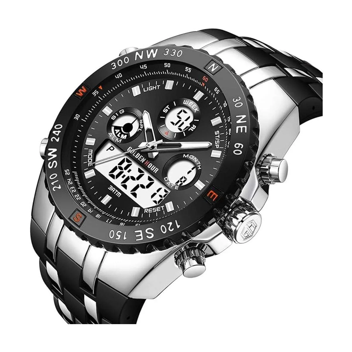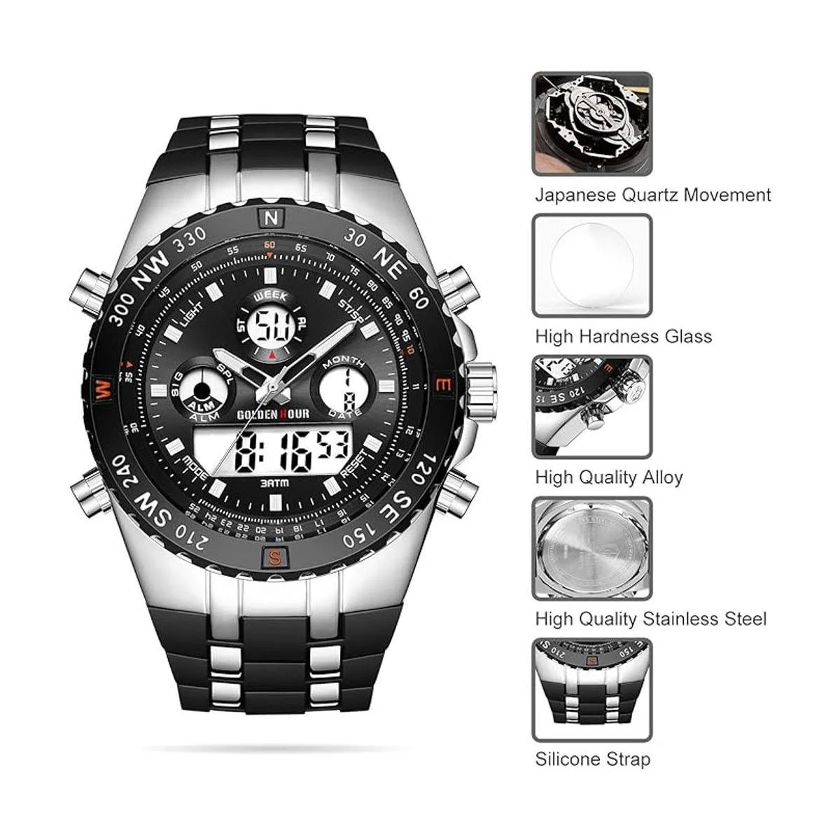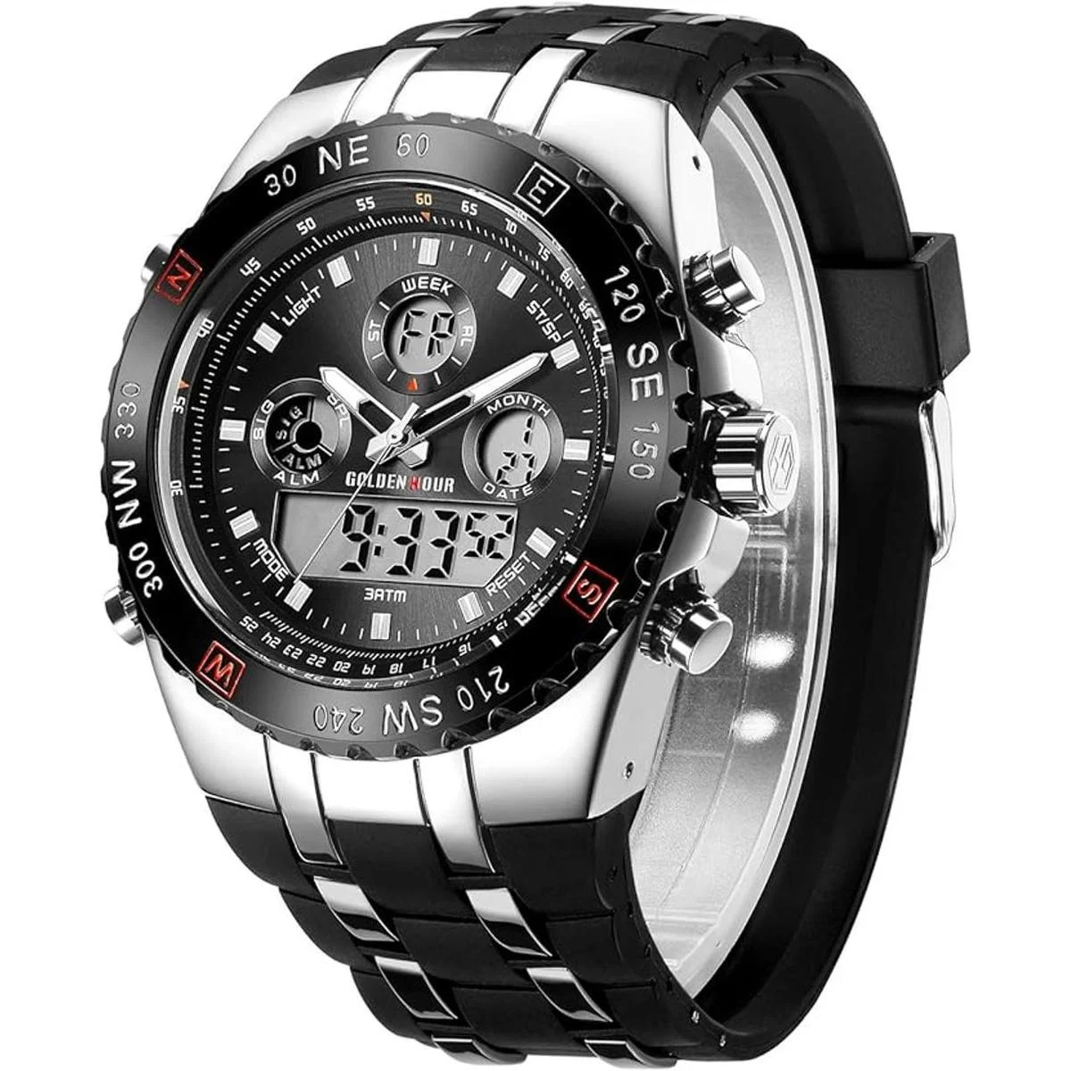 GOLDEN HOUR Relojes deportivos militares de lujo para hombre, de gran tamaño, 3ATM, impermeable, cronómetro, fecha y fecha, alarma, reloj de pulsera analógico digital luminoso con banda de goma, Digital