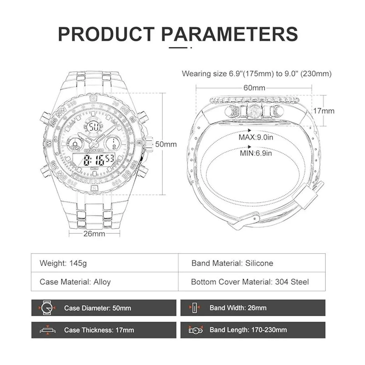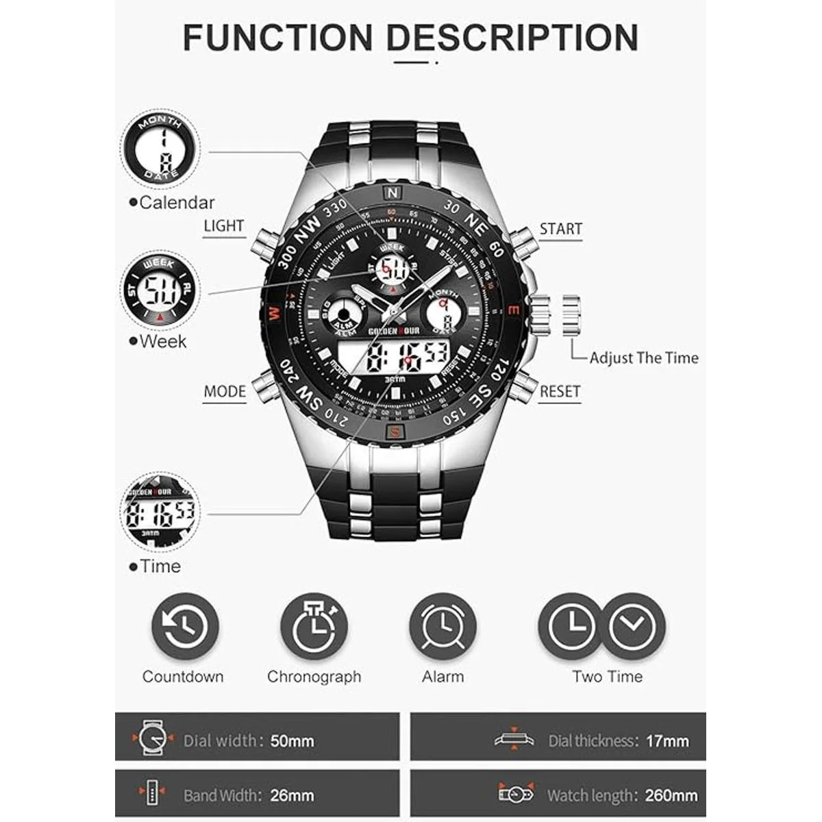 Reloj deportivo multifuncional: pantalla digital analógica de doble hora, formato militar de 12/24 horas, calendario día, fecha y mes, cronómetro, timbre horario, despertador y función de hora dividida