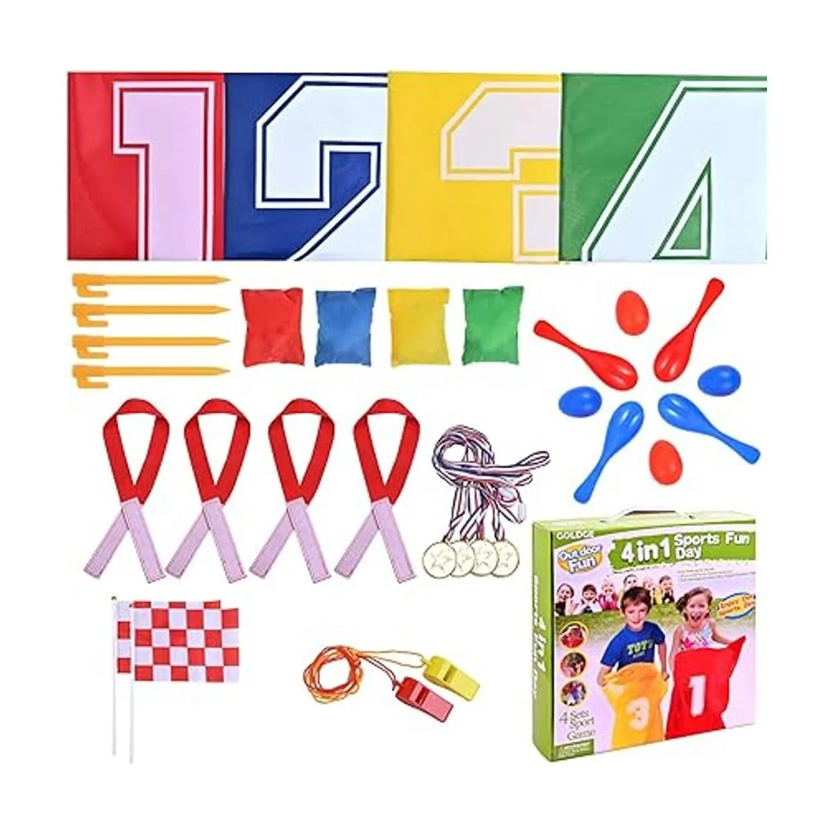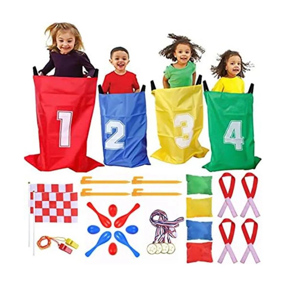 GOLDGE Juegos al aire libre para niños de 3 a 7 años, bolsas de carreras de sacos de patata, juego de lanzamiento de puf, 3 bandas de carreras de patas, juego de carreras de huevos y cucharas, juegos de patio, juegos de carnaval para fiestas infantiles, juegos de camping