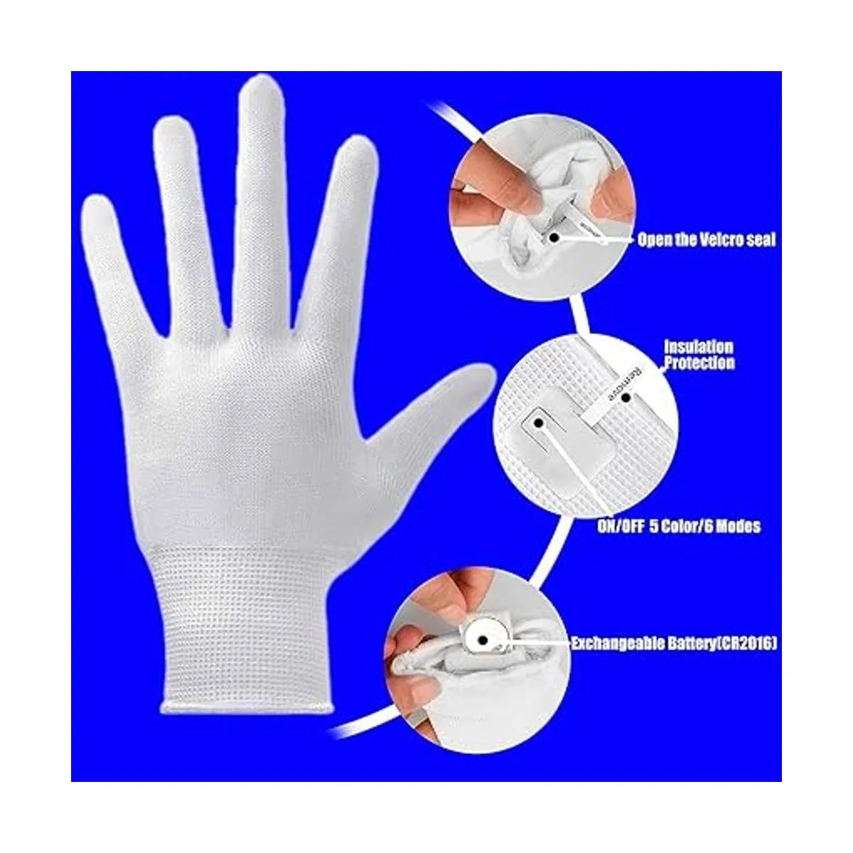 Simplemente retira la pestaña de la batería para activar las luces de los guantes. Cada guante brilla verde, rojo, blanco, amarillo azul en 6 modos diferentes. Puedes tocar ligeramente el interruptor de los guantes y parpadeará con luces coloridas.