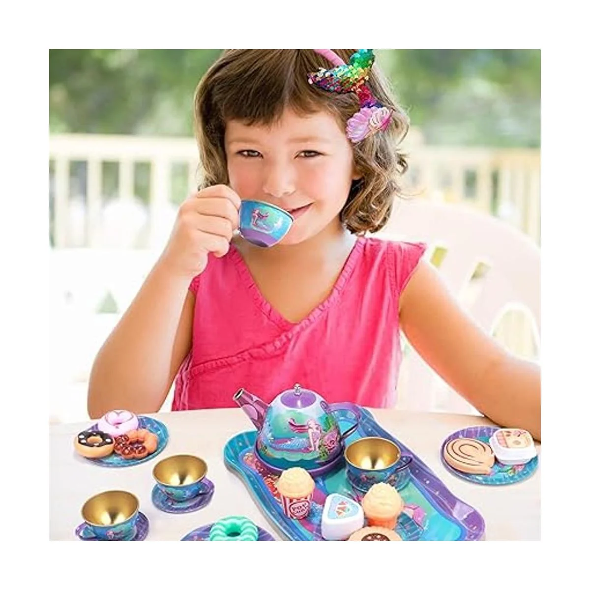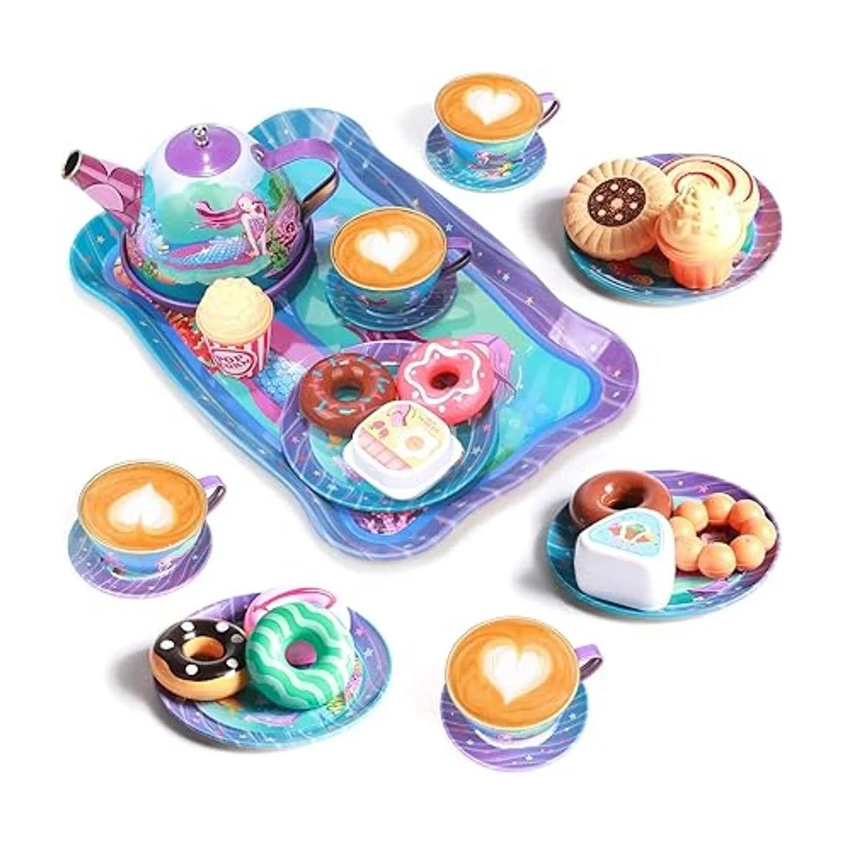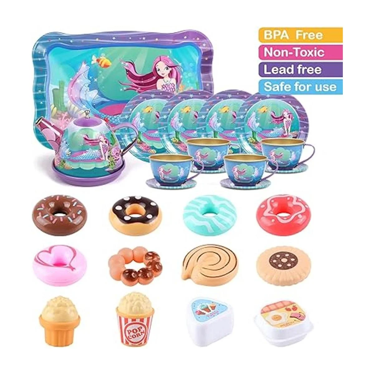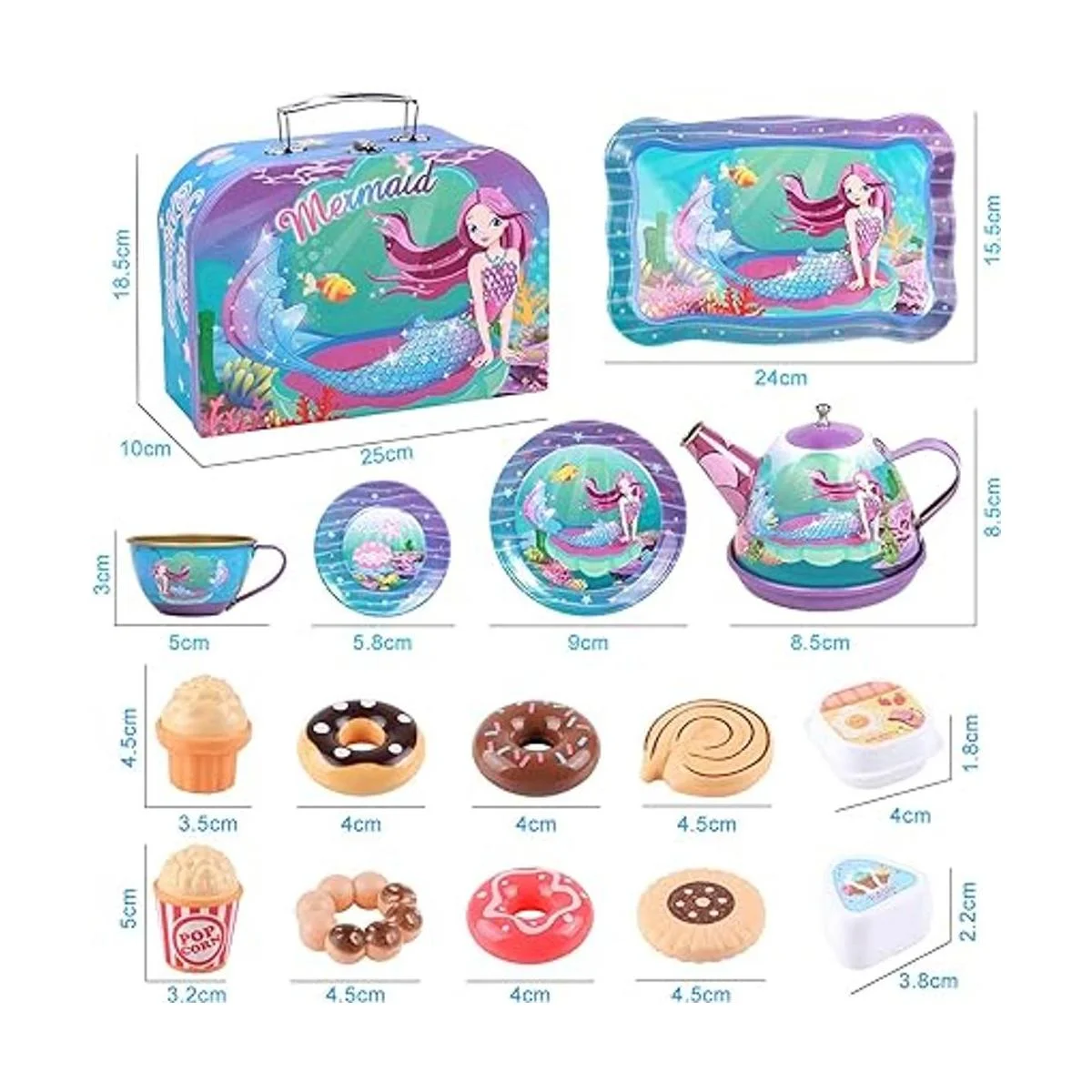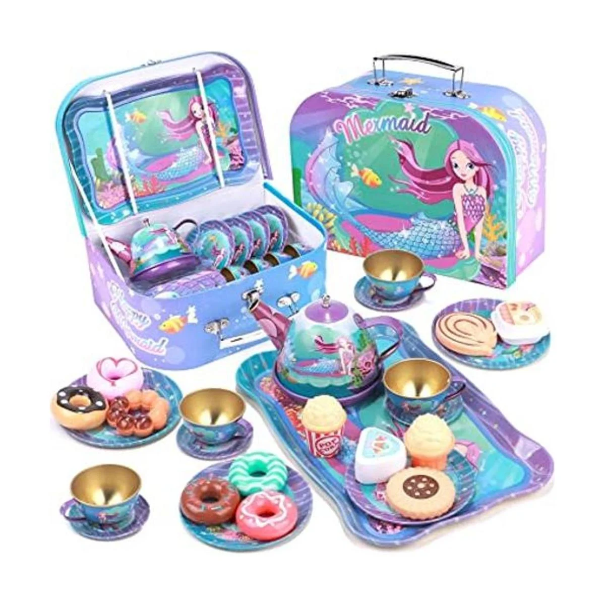 Golray Juego de 27 piezas de té para niñas pequeñas, regalo de sirena, juguete de simulación, juego de té de lata, estuche de transporte y comida dulces, juego de té de princesa, cocina, juego de té, juguetes