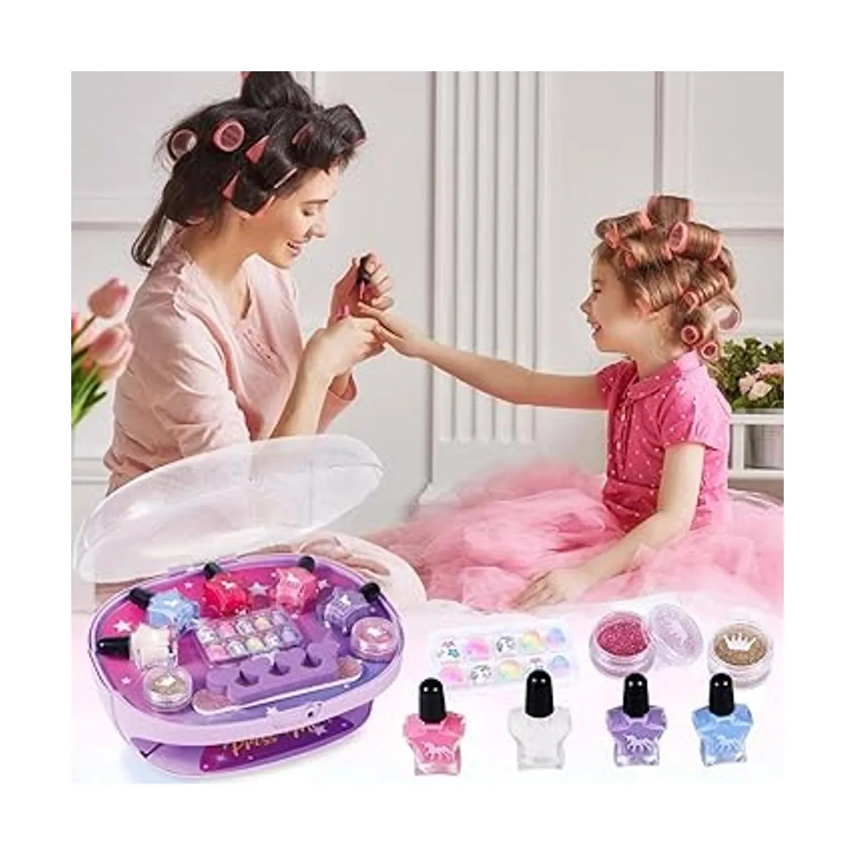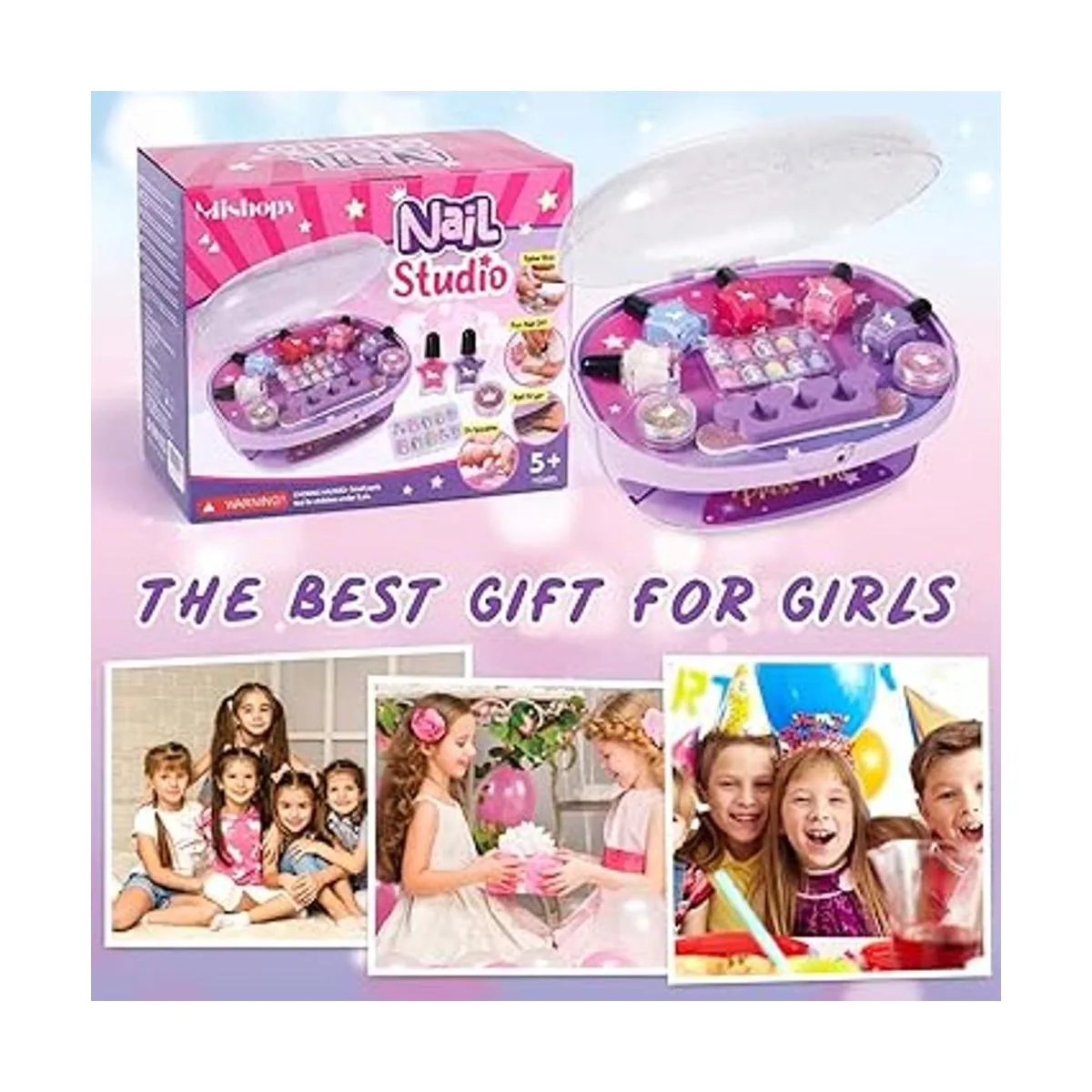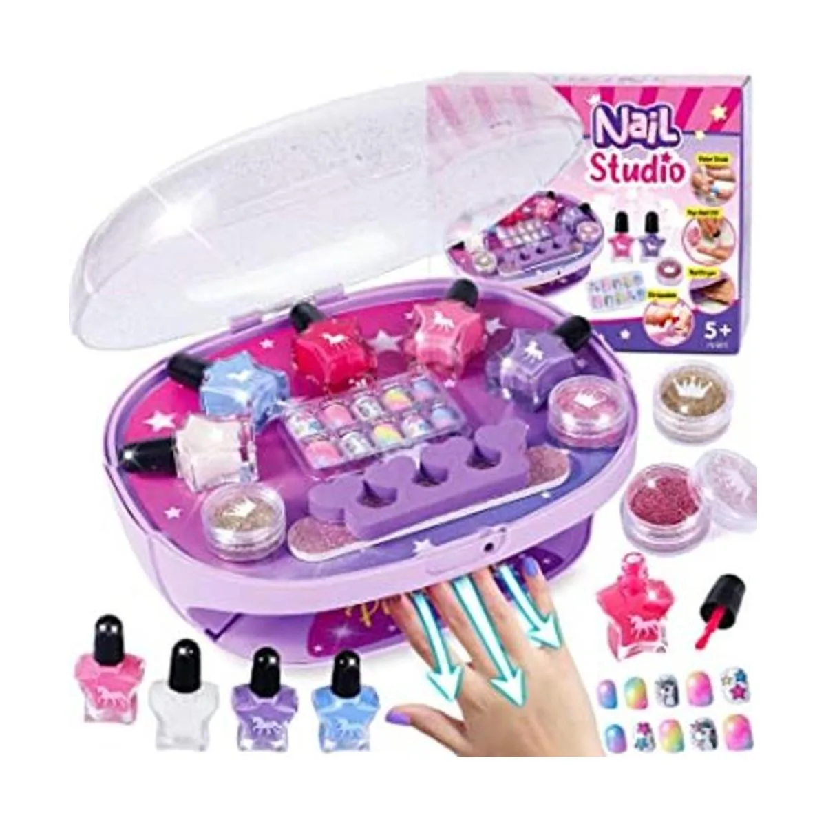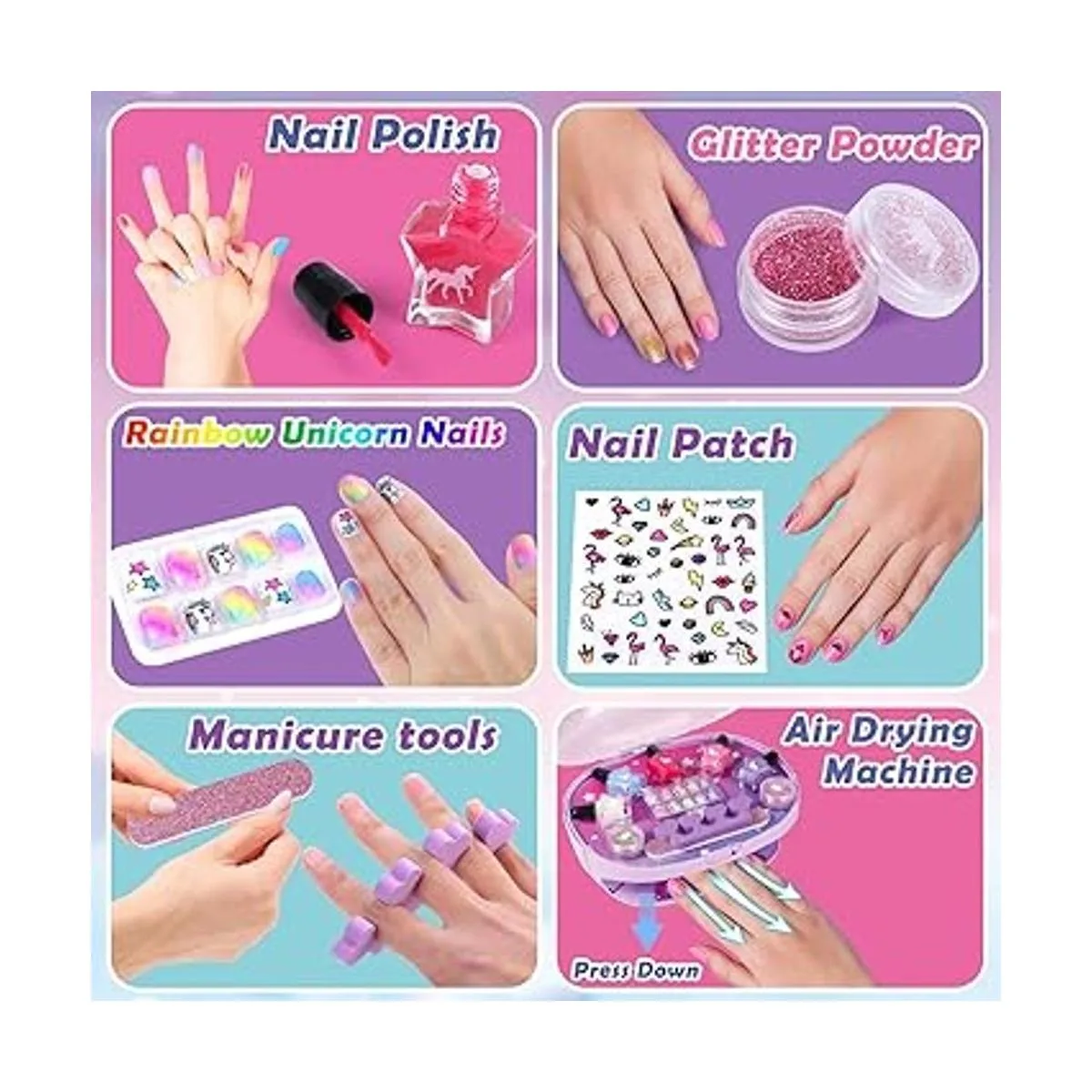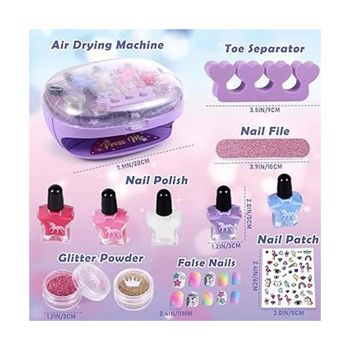 Golray Juego de esmaltes de uñas para niños para niñas, kit de arte de uñas todo en uno, secador de uñas, esmalte de uñas, polvo de purpurina, uñas postizas, calcomanías de uñas, separador de dedos, lima de 3 a 12 años