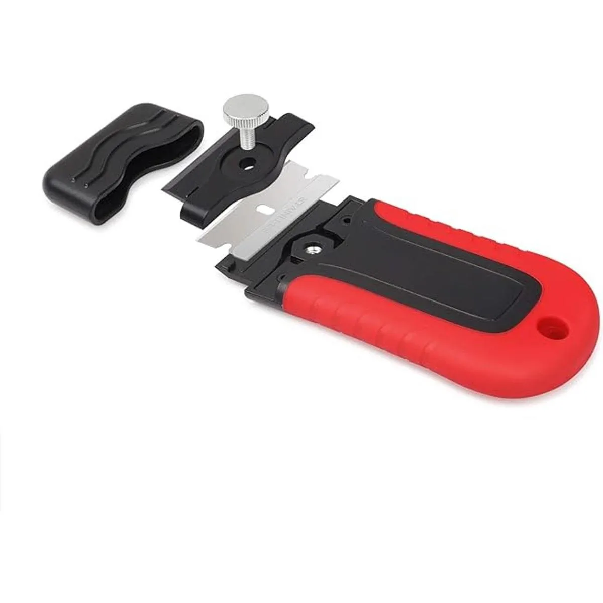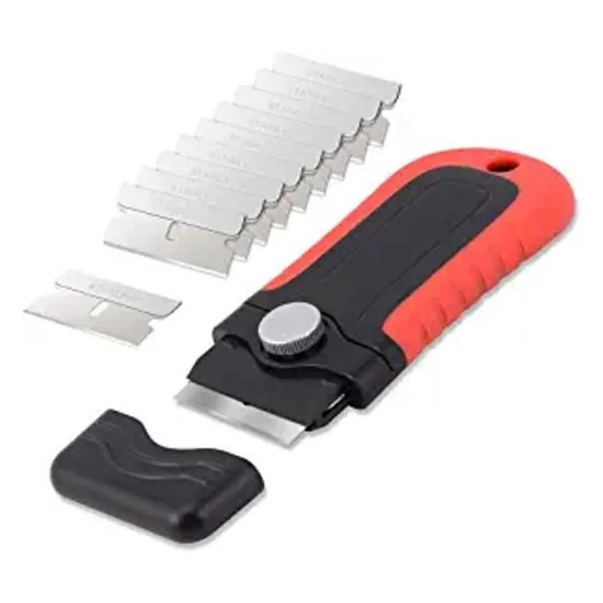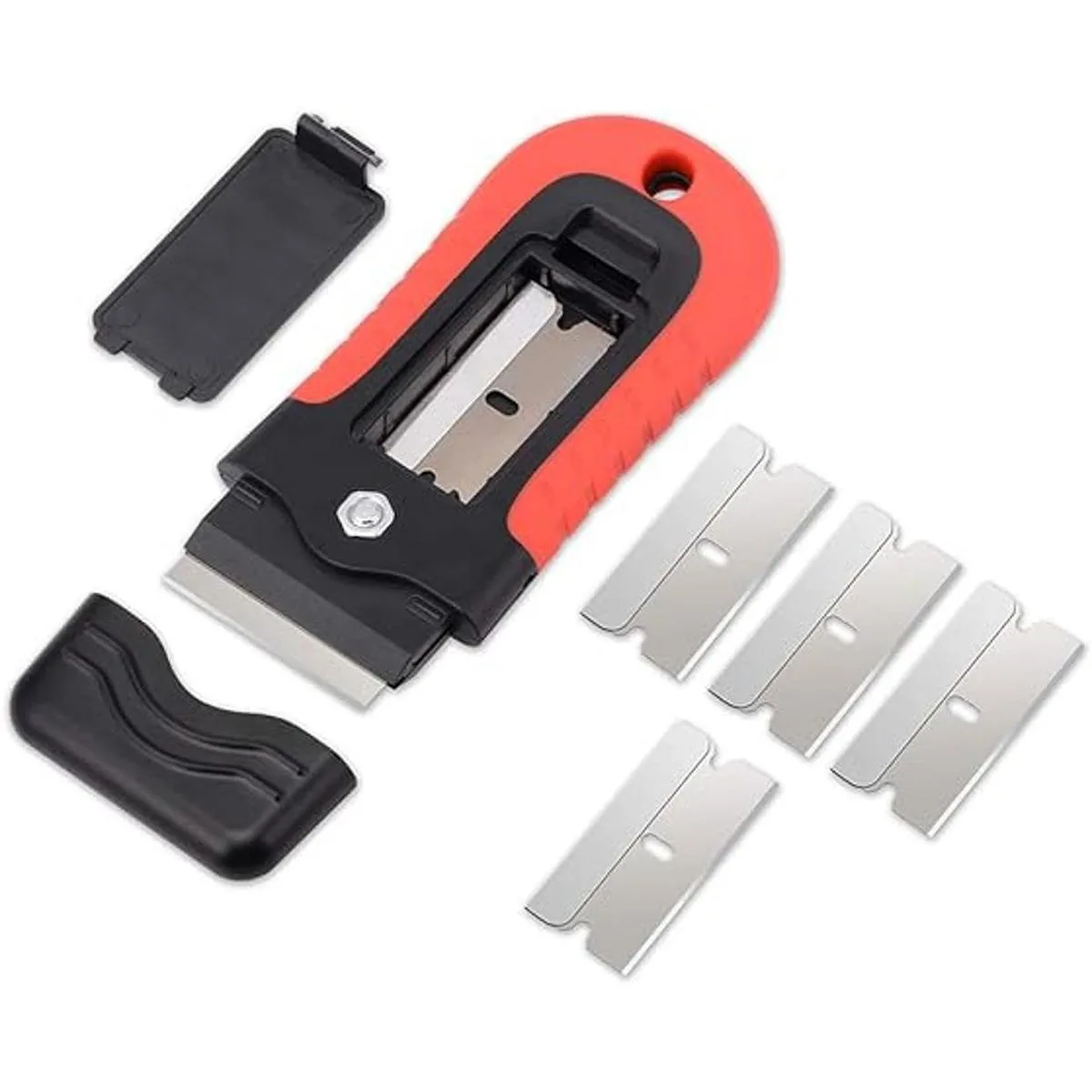 Gomake Rascador de cuchilla de afeitar con tapa de seguridad, raspador de vidrio con 10 cuchillas de acero inoxidable para limpieza de vidrio, pintura y etiquetas antiguas, removedor de calcomanías, herramienta raspadora de estufa