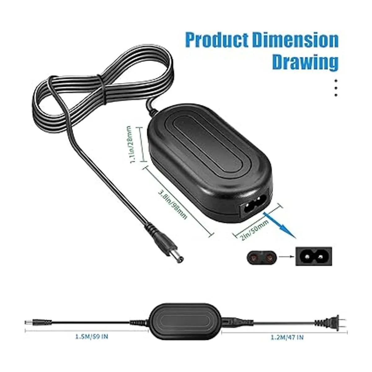 Lista de embalaje: 1 adaptador de corriente de CA externo ACLS5, 1 conector DKX1 CC acoplador y un cable de alimentación de CA de enchufe estadounidense.