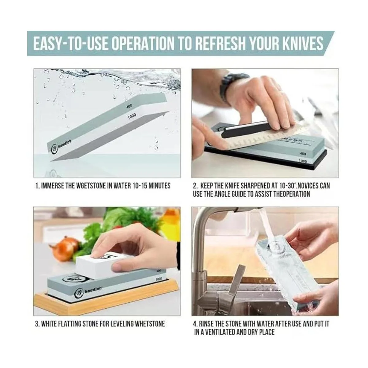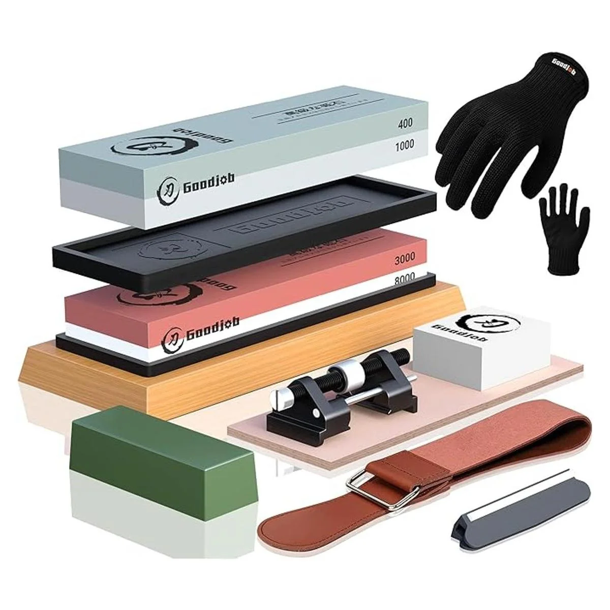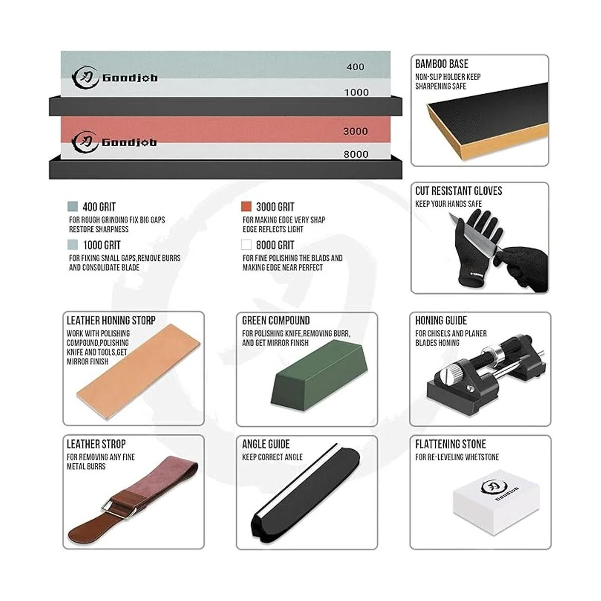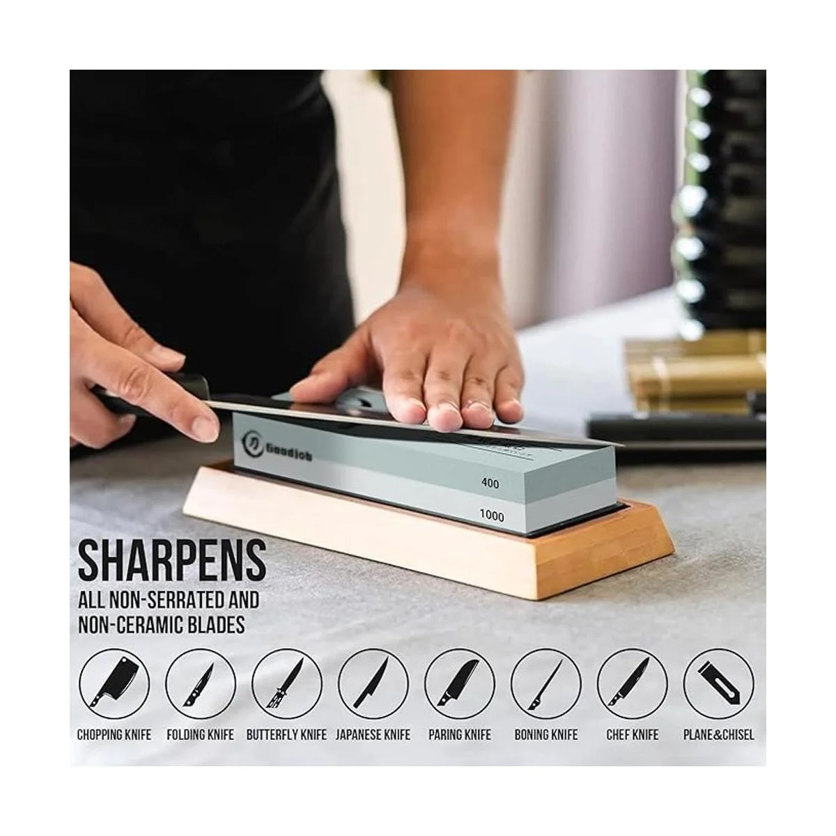 Goodjob Juego completo de afiladores de cuchillos japoneses de primera calidad de piedra de afilar de cuchillos Piedra de agua de grano doble 4001000 30008000 con guantes resistentes a los cortes, guía de afilado de cincel, base de bambú
