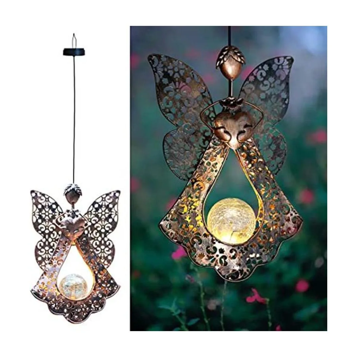 GOODME Luces solares colgantes para exteriores, impermeable, farol solar LED, regalo conmemorativo de ángel de metal, con globo agrietado, decoración de cristal para porche, patio, patio, jardín