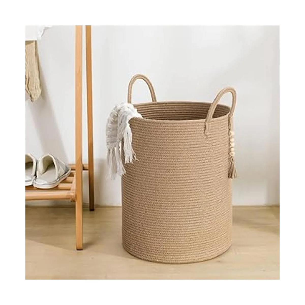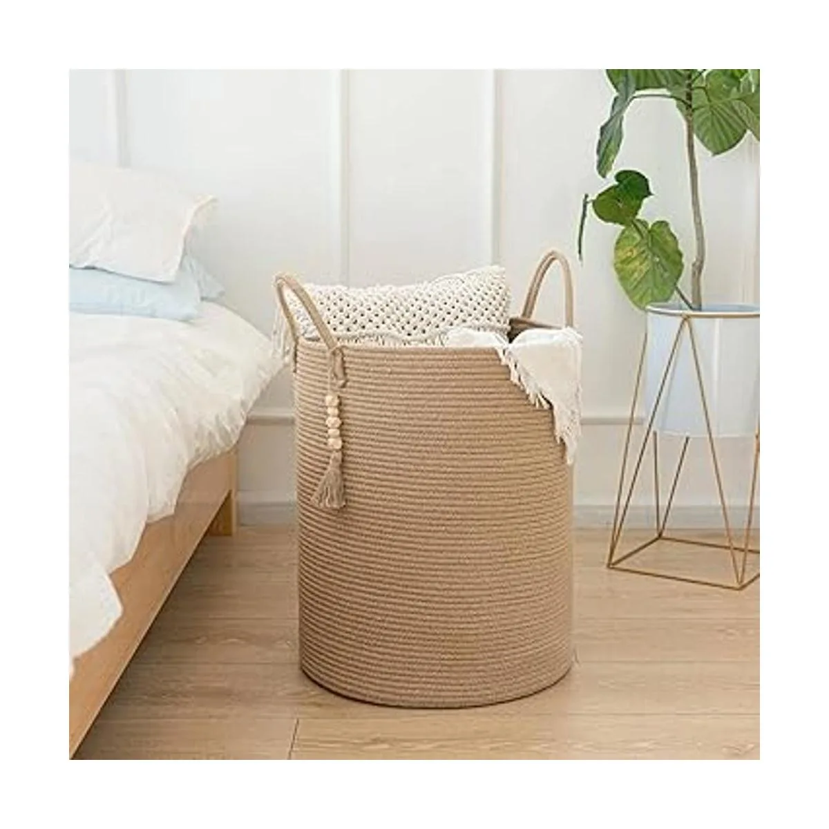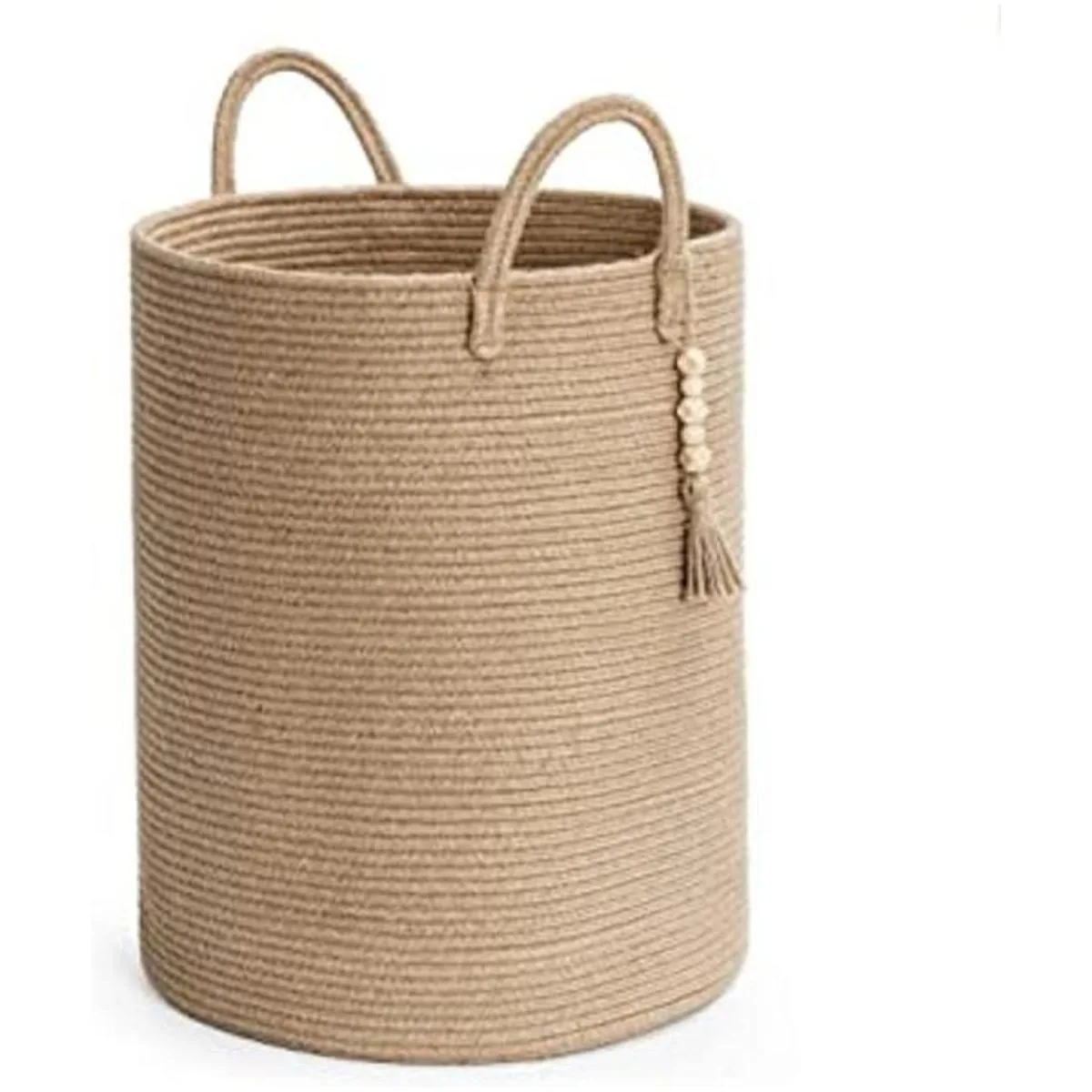 Decoración única para el hogar. Esta cesta de yute viene con una borla de cuentas de madera que se ata a un mango lateral de la cesta, por lo que es adecuada para decorar hogares de estilo bohemio o granja. Esta cesta de granja es una hermosa decoración para la sala de estar, dormitorio, lavandería o gimnasio en casa, satisface las necesidades de almacenamiento mientras añade un toque de estilo a la casa
