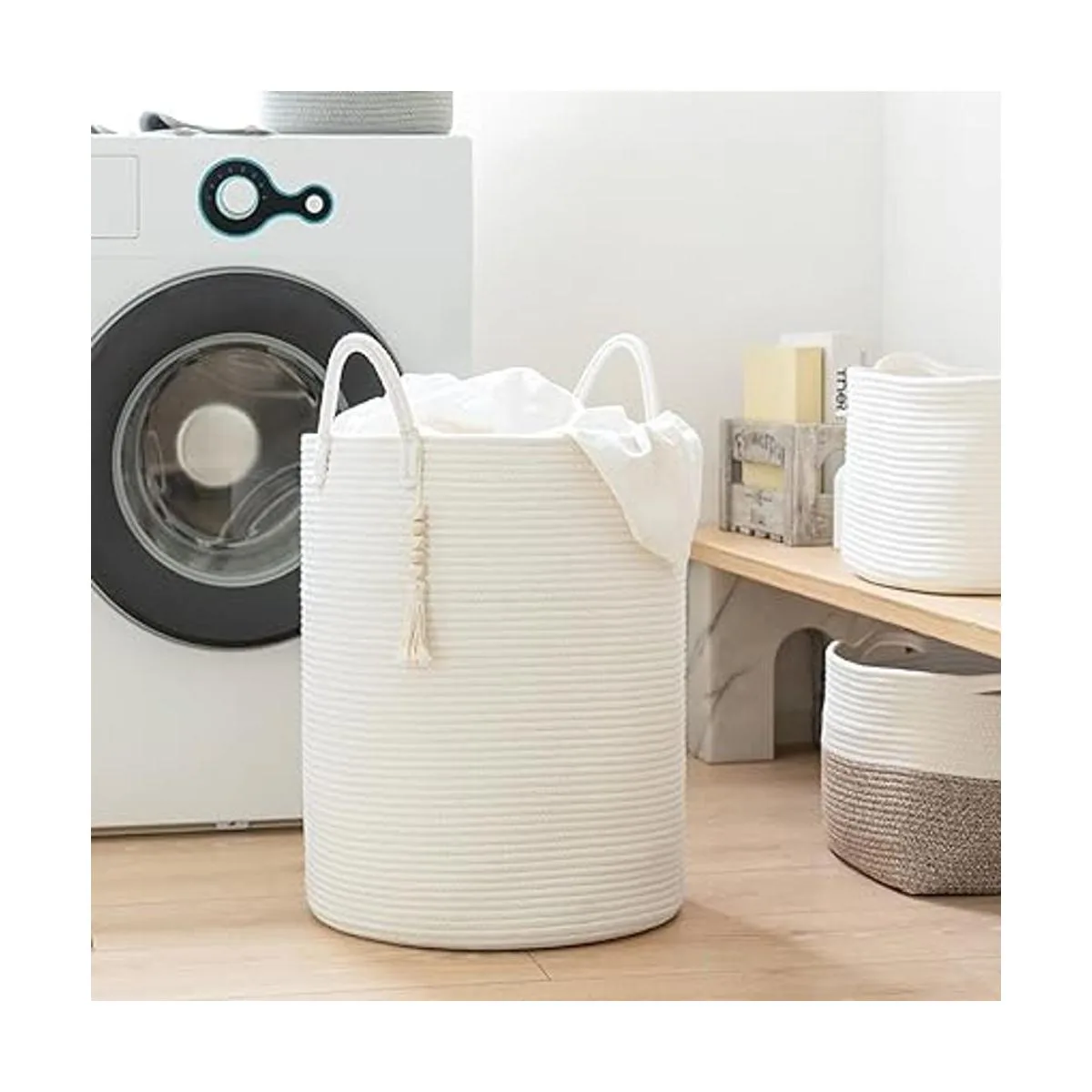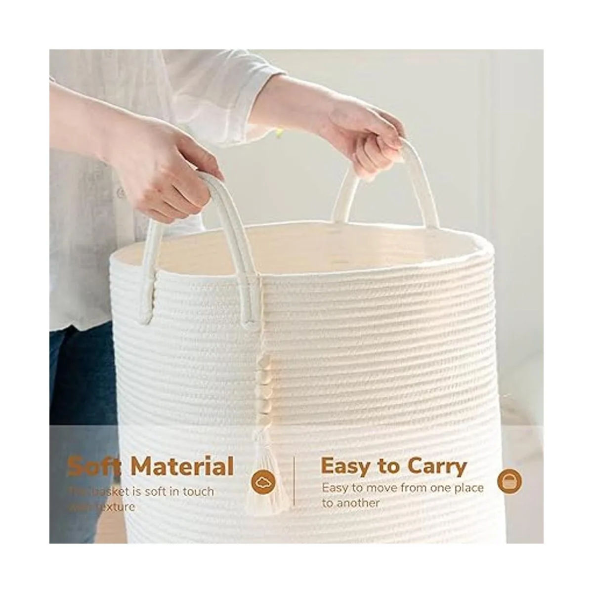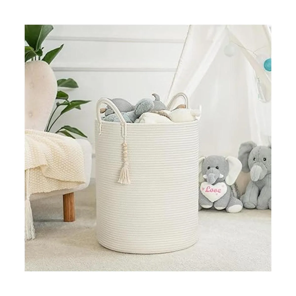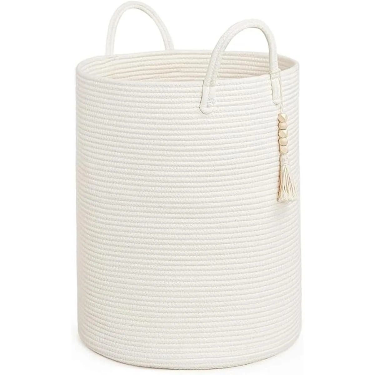 Decoración única para el hogar. Esta cesta de almacenamiento viene con una borla de cuentas de madera que se ata a un mango lateral de la cesta, por lo que es adecuada para decorar hogares de estilo bohemio o granja. Es una hermosa decoración para la sala de estar, dormitorio, lavandería, guardería o sala de juegos, satisfaciendo las necesidades de almacenamiento mientras añade un toque de estilo a la casa