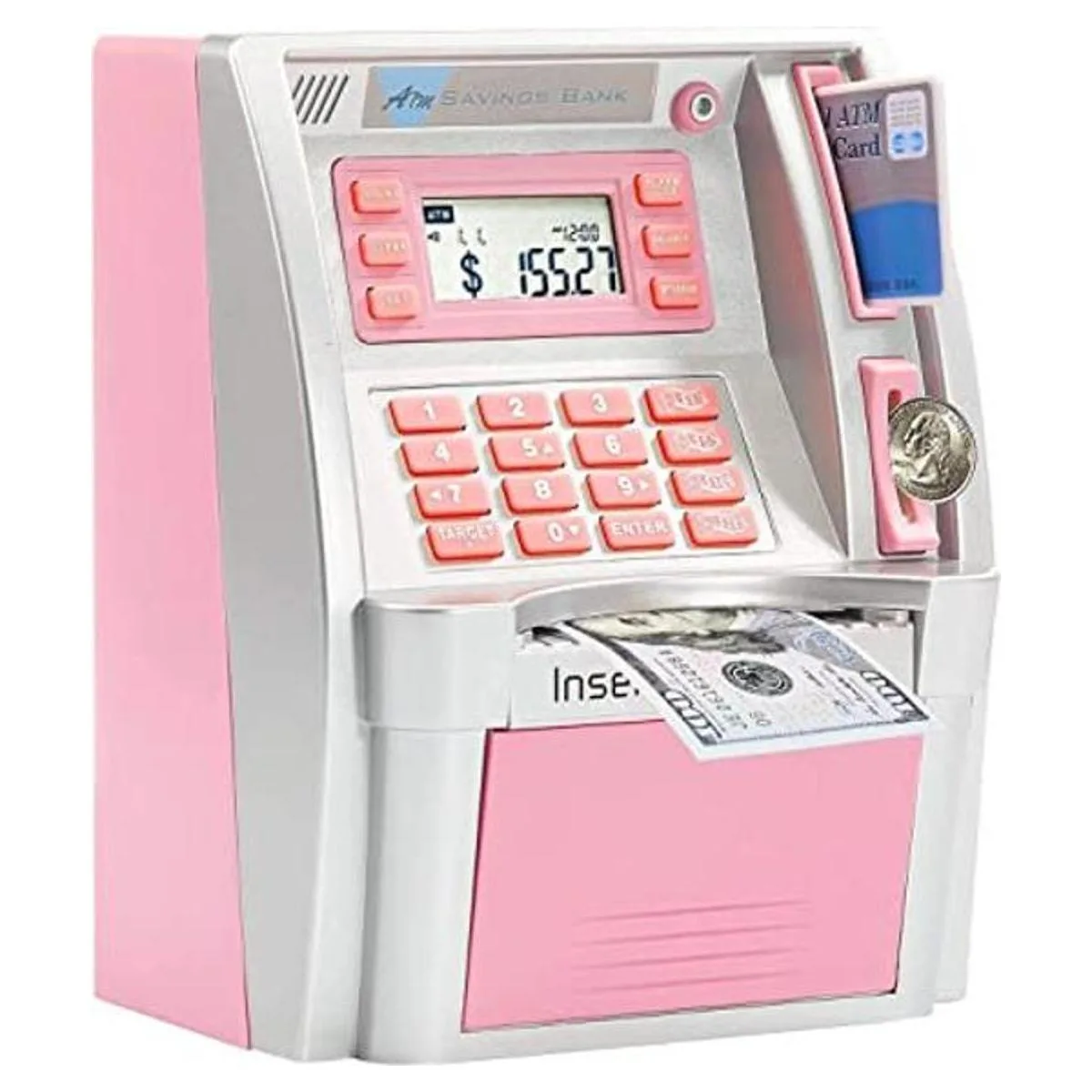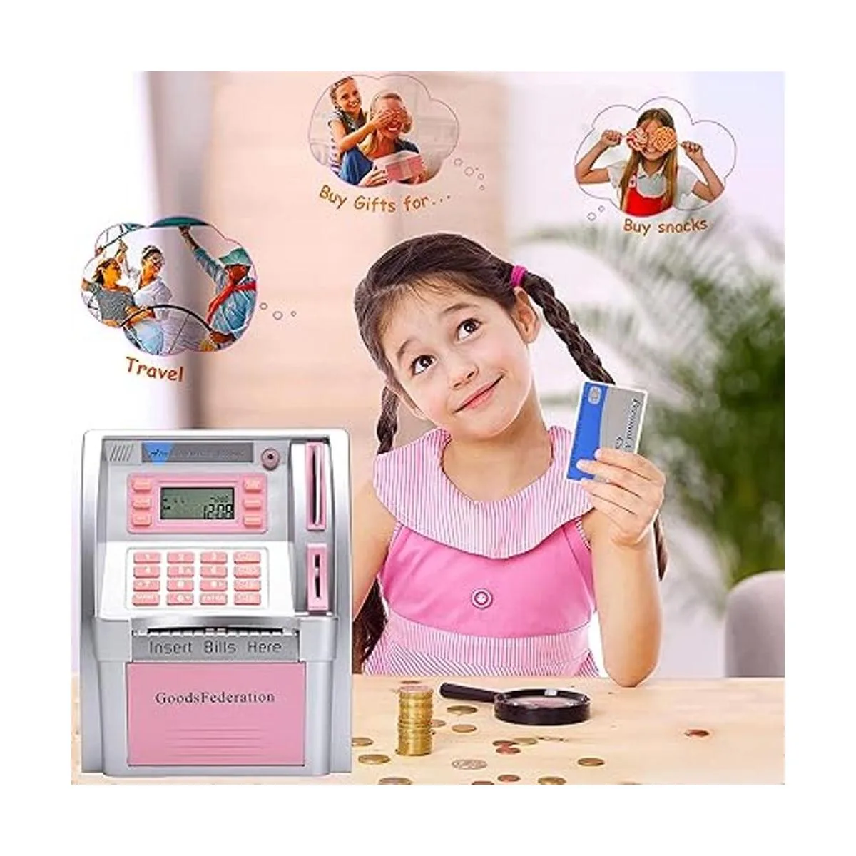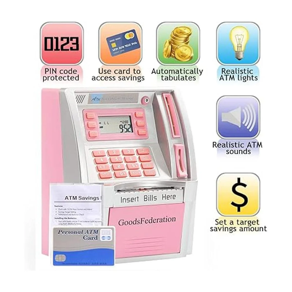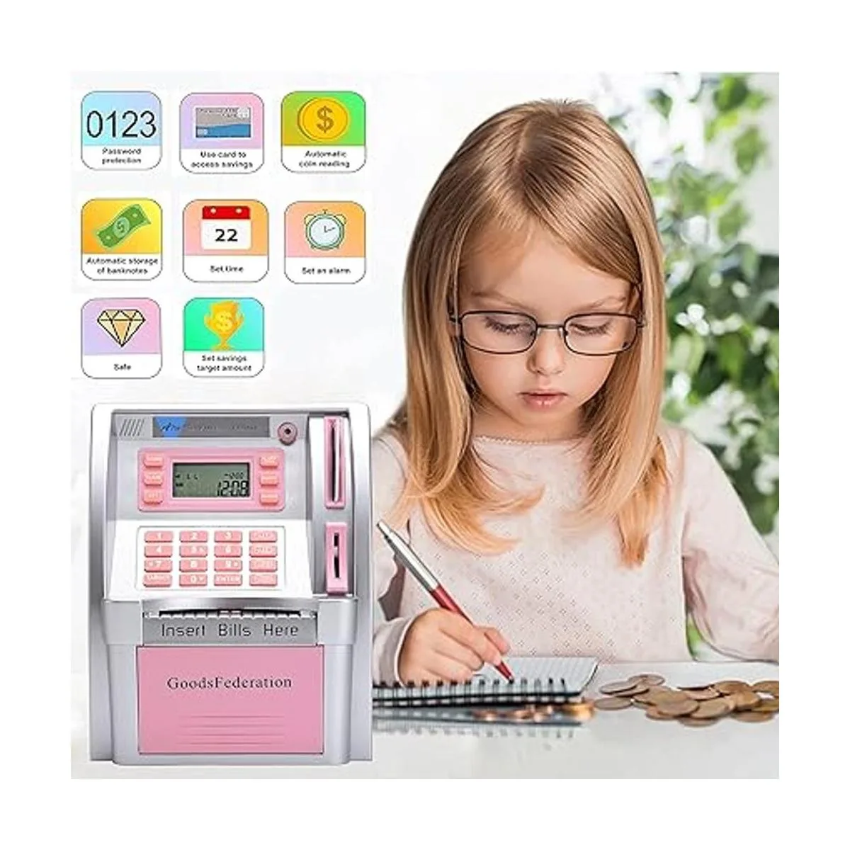 Ajuste de objetivos: pulsa la tecla de equilibrio para comprobar tu saldo, pulsa la tecla de objetivo, los niños pueden comprobar la pantalla LCD para ver la cantidad que todavía se necesita para alcanzar sus objetivos. Una manera interesante de enseñar a tus niños o niñas a ahorrar dinero y rastrear sus ahorros.