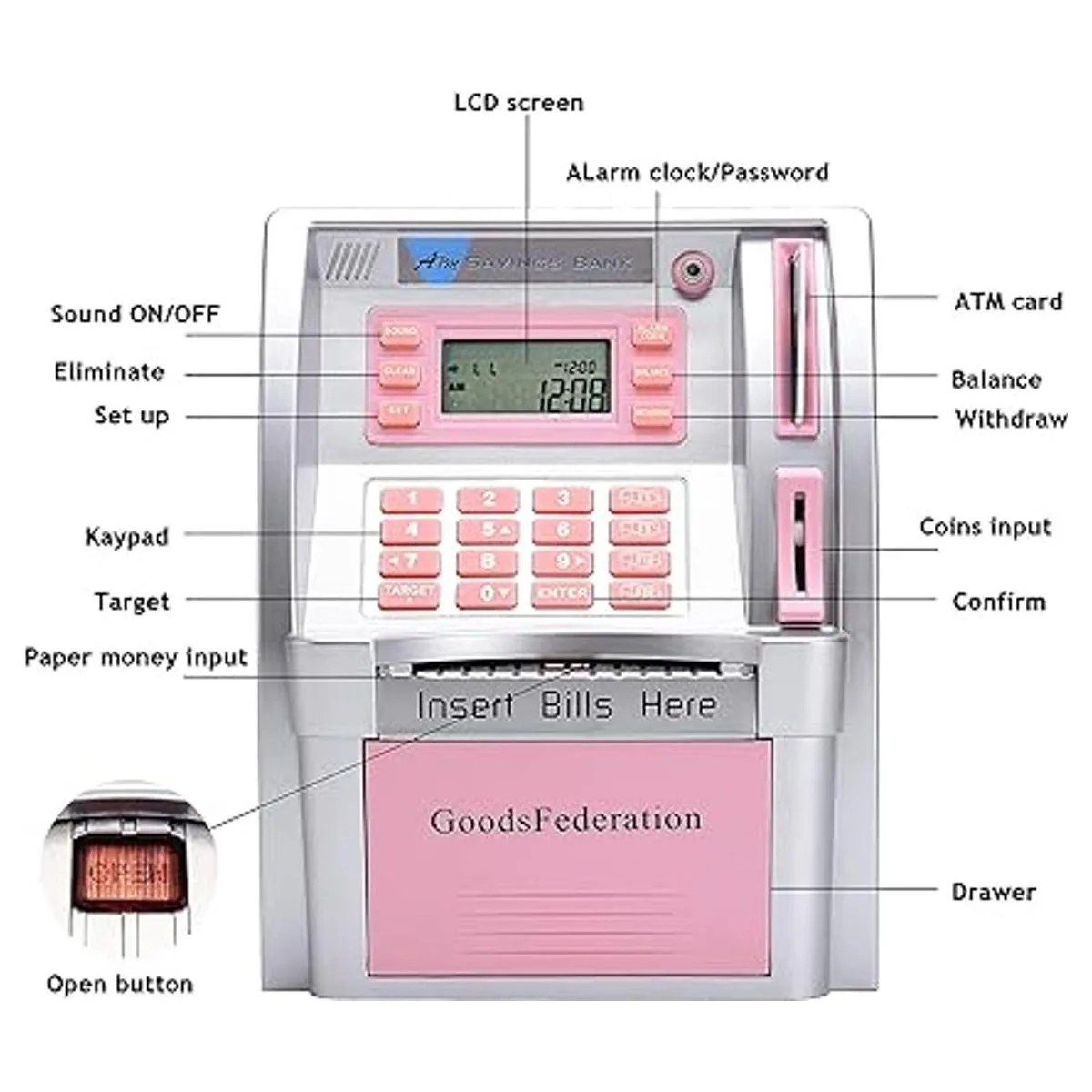 Reconocimiento automático de monedas: inserta monedas en la ranura y reconocerá y mostrará lo que se han depositado las monedas. Pulsa la tecla WITHDRAW, luego la tecla OPEN se iluminará, pulsa la tecla OPEN para liberar la puerta y sacar el dinero que desees.