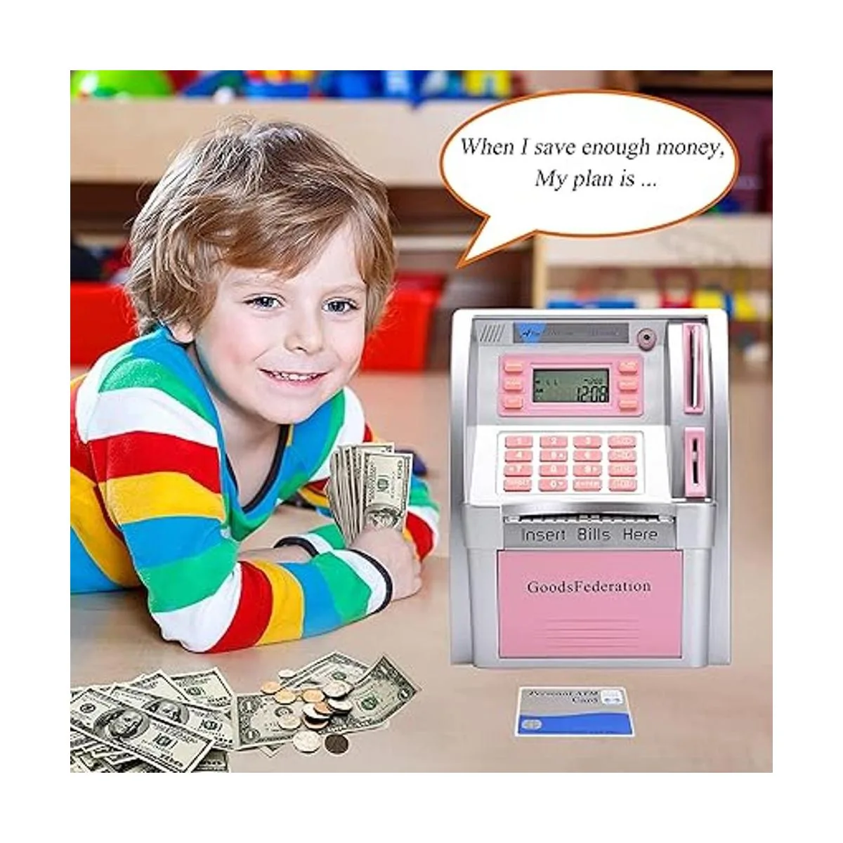 Utiliza una tarjeta bancaria realista y código PIN para acceder: simplemente inserta la tarjeta e introduce la contraseña de 4 dígitos, la pantalla LCD se ilumina y hace que el mensaje de voz. Un divertido juguete educativo de ahorro financiero para tus hijos, es perfecto para regalo de Navidad o regalo de cumpleaños.