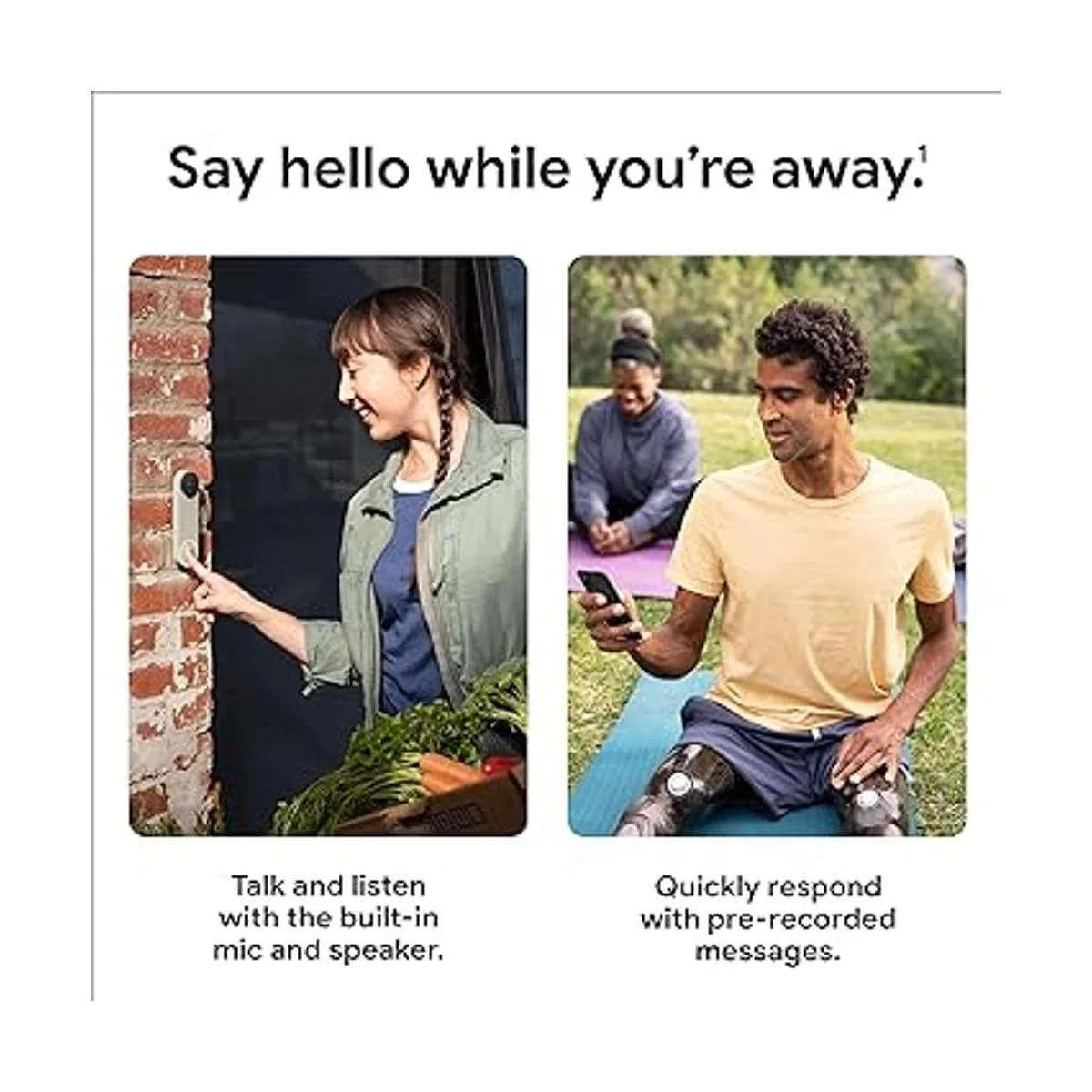 Habla y escucha a los visitantes en tu puerta, incluso si estás fuera 1; utiliza la aplicación Google Home para decir que estarás ahí mismo, pídele a un repartidor que deje tu paquete o responda a los visitantes con mensajes pregrabados1