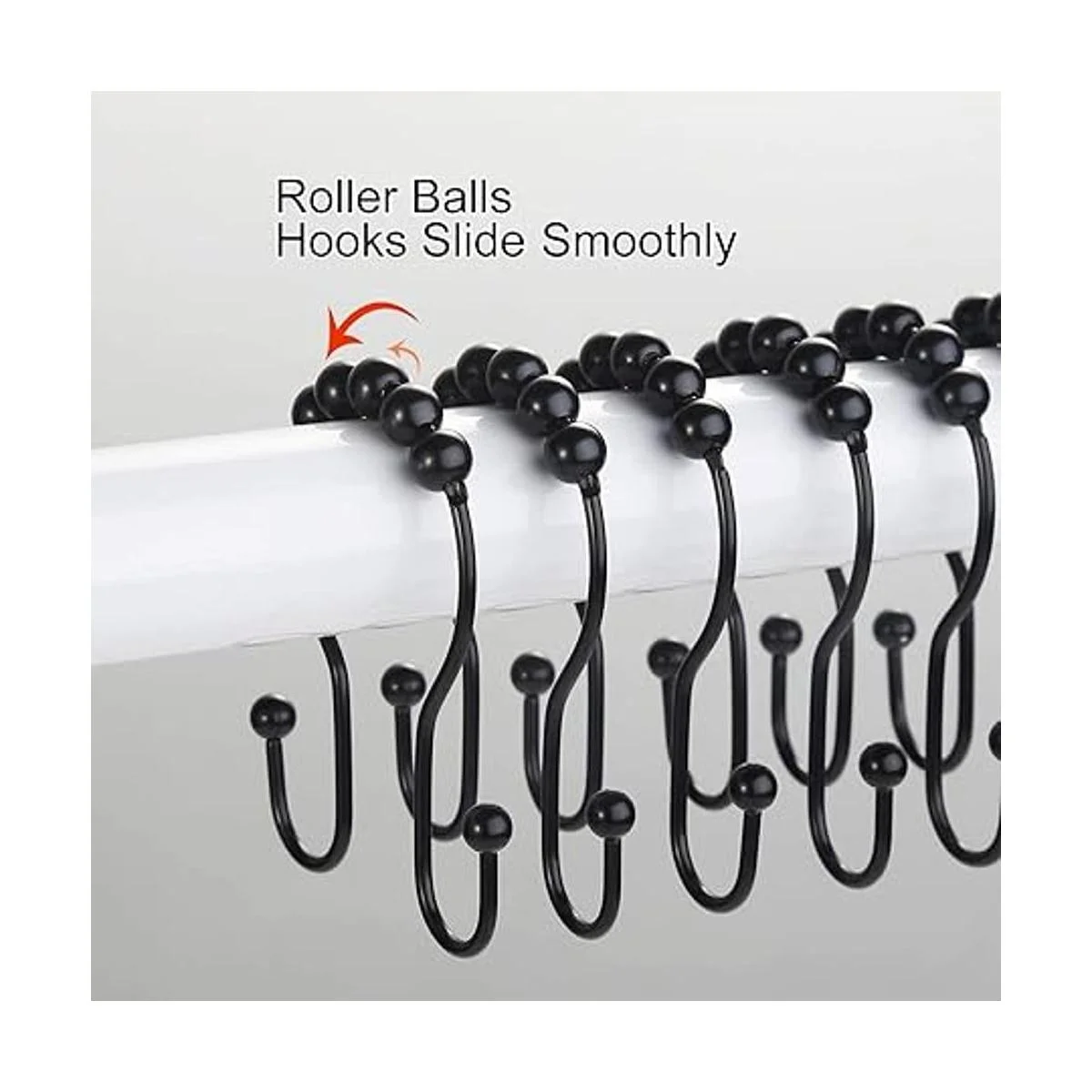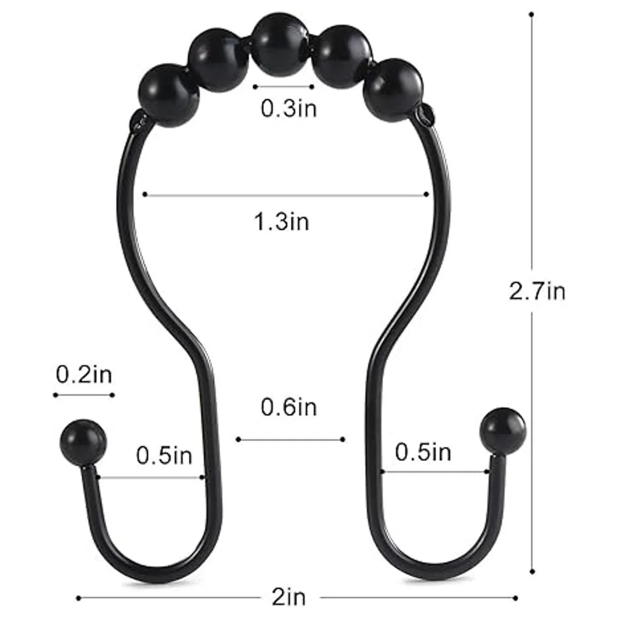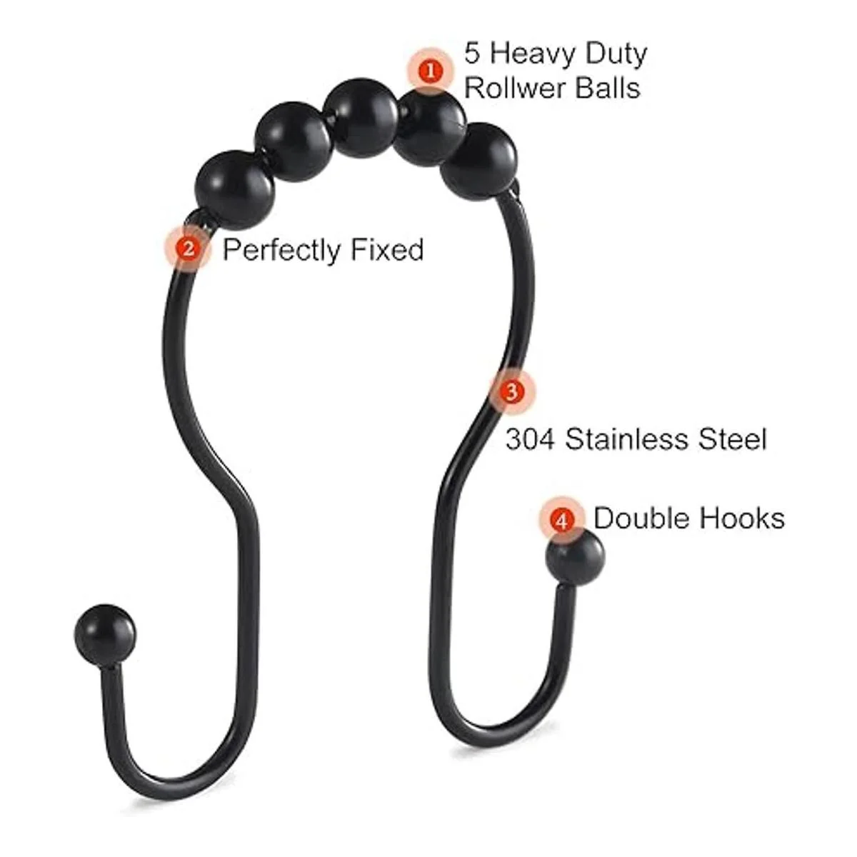 Ganchos de ducha doble: Los ganchos negros para cortinas de ducha están hechos con una exquisita artesanía. El obstáculo en ambos lados fija las bolas de rodillos para mantener el equilibrio, lo que evita que la cortina de ducha se caiga, es lo suficientemente fuerte como para sostener tanto la cortina pesada como el forro.
