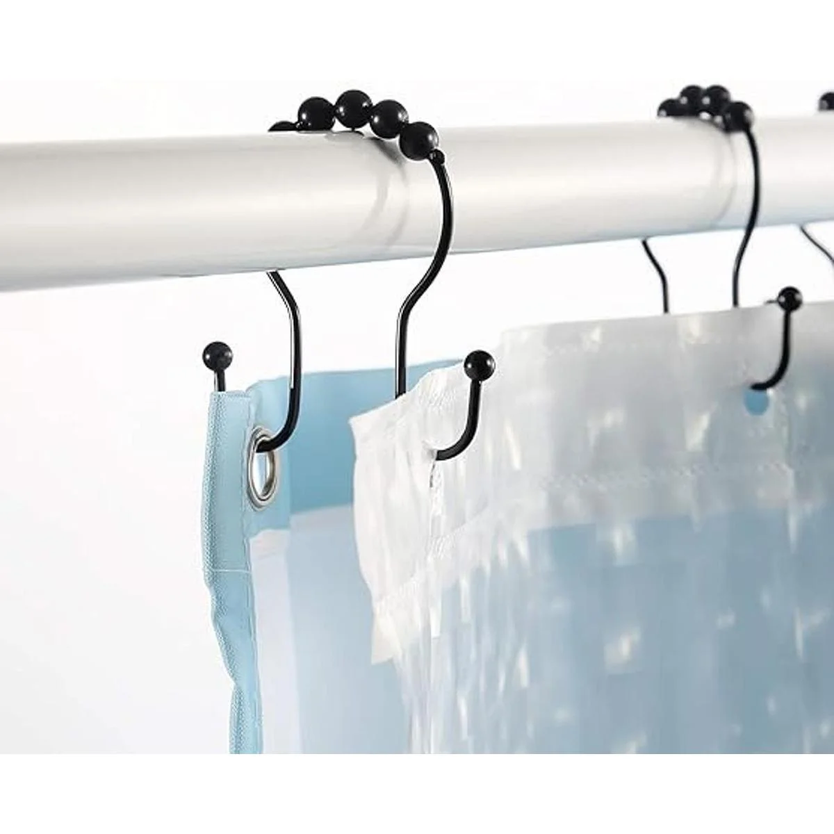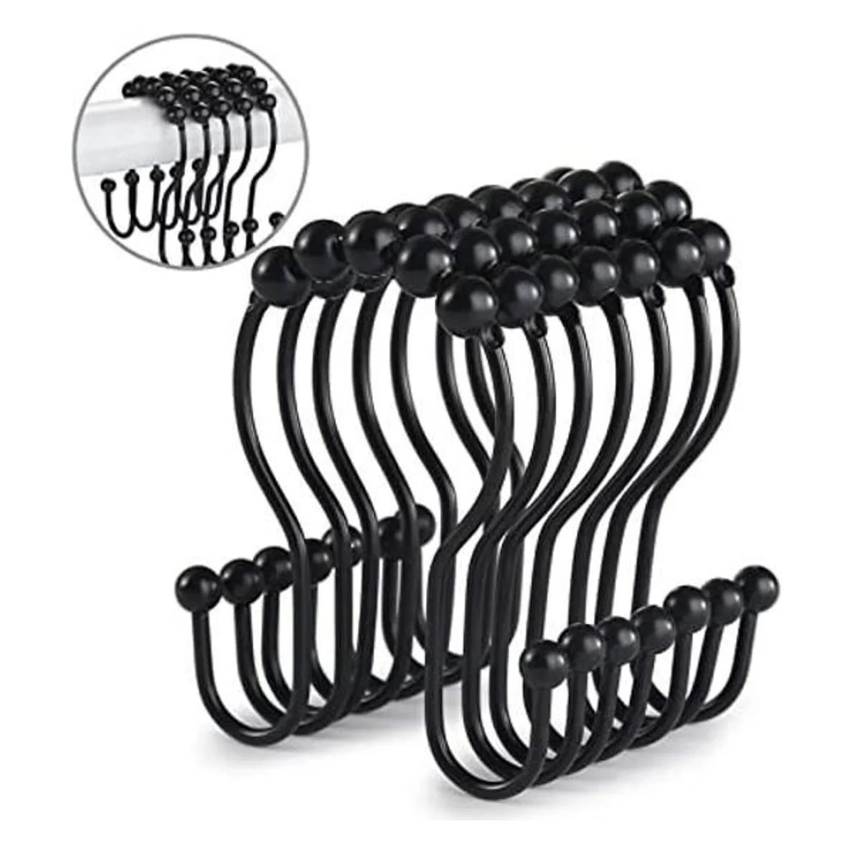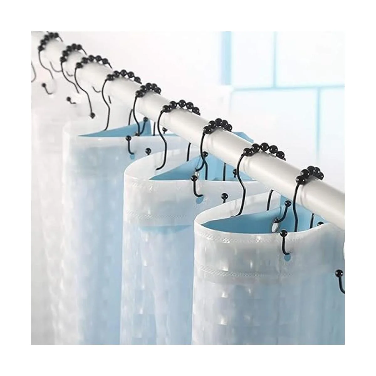 Ganchos de ducha doble: Los ganchos negros para cortinas de ducha están hechos con una exquisita artesanía. El obstáculo en ambos lados fija las bolas de rodillos para mantener el equilibrio, lo que evita que la cortina de ducha se caiga, es lo suficientemente fuerte como para sostener tanto la cortina pesada como el forro.
