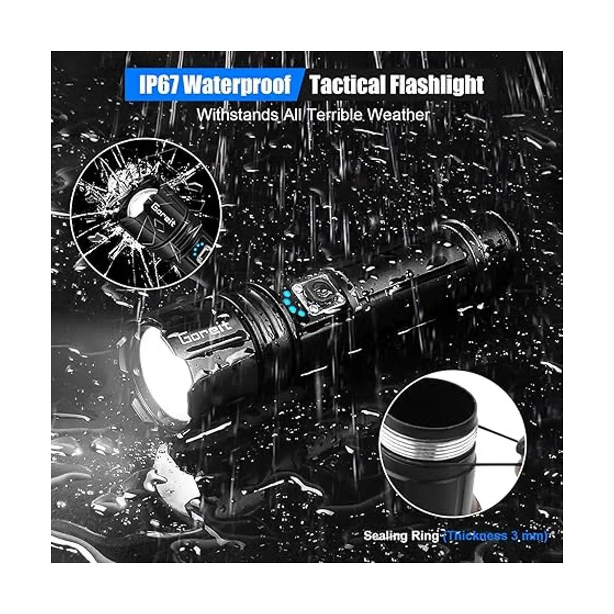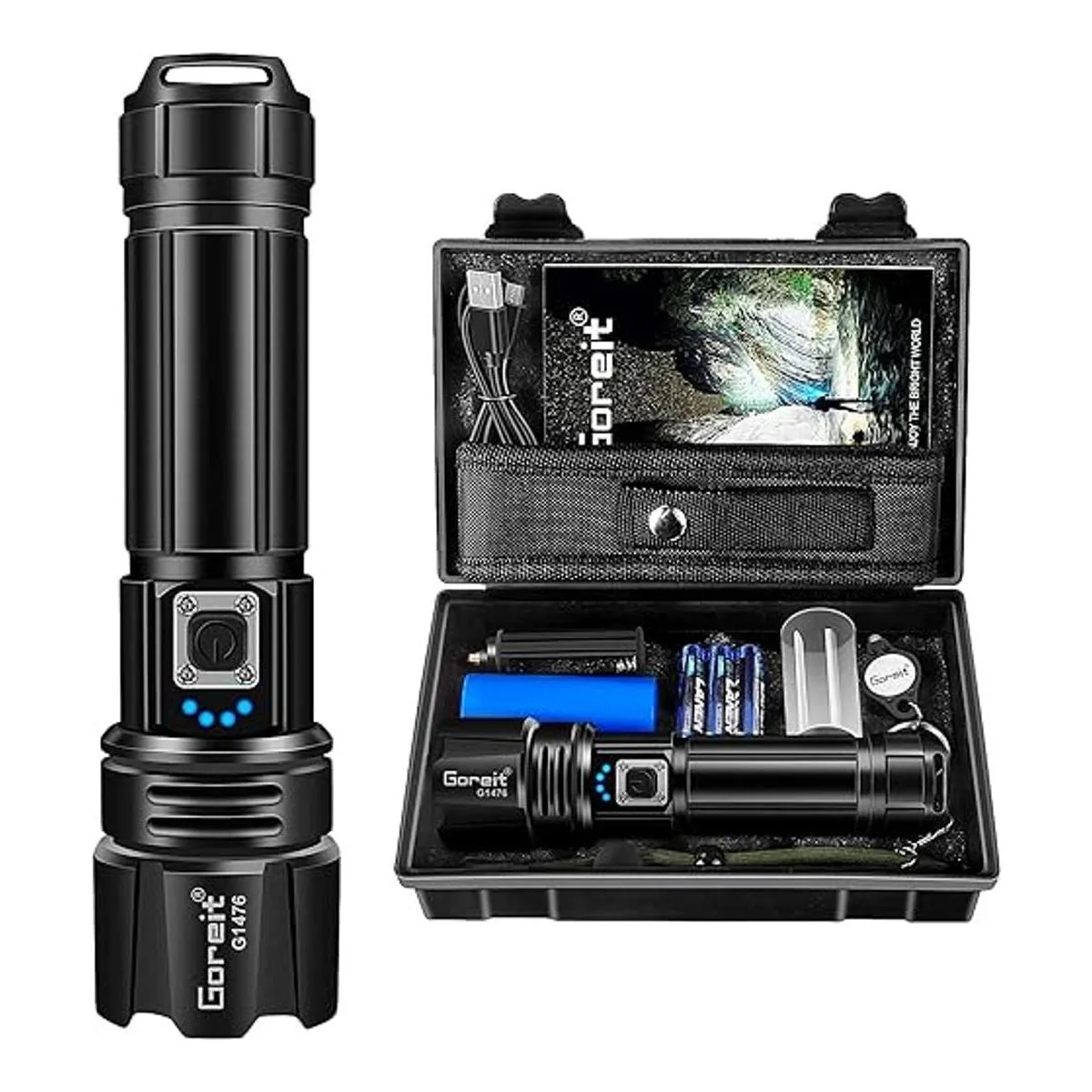 Goreit Linterna de alto lúmenes recargable, 20000 lúmenes LED XHP70.2 USB súper brillante, linternas de mano de alta potencia para emergencias de campamento, IP67 impermeable, con zoom