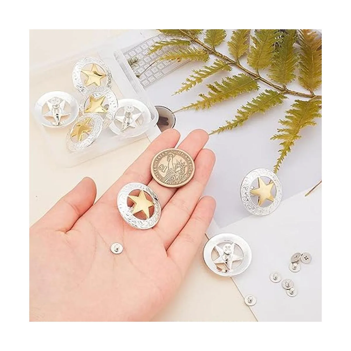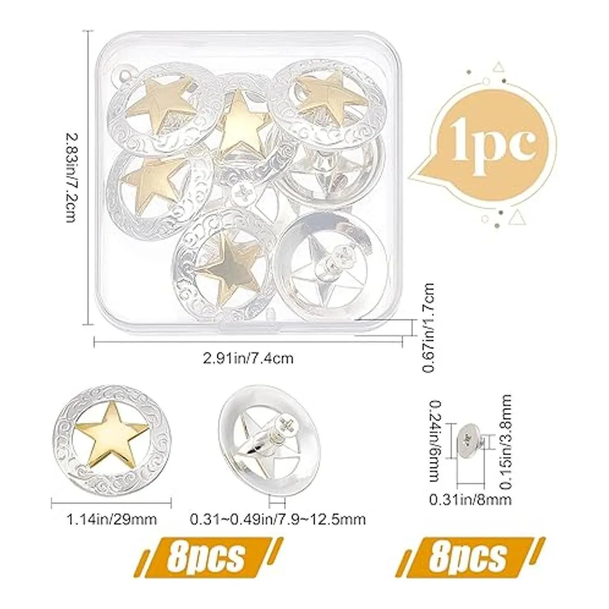 1 caja de 8 botones: viene con 8 botones de decoración, cada juego consta de 1 tapa y 1 remache. Estos botones de repuesto se colocan en una caja de plástico, en caso de faltar, fácil de almacenar y encontrar el próximo uso