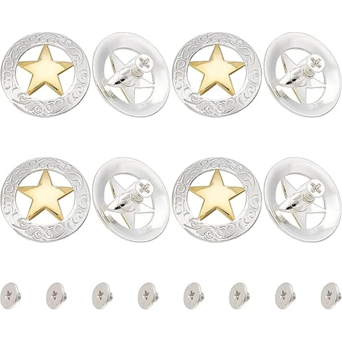 GORGECRAFT 1 caja de 8 juegos de 8 botones decorativos con diseño de estrella dorada grabada en plata, de repuesto con hebilla redonda, vintage, manual de personalidad, para equipaje, ropa, decoración de cuero