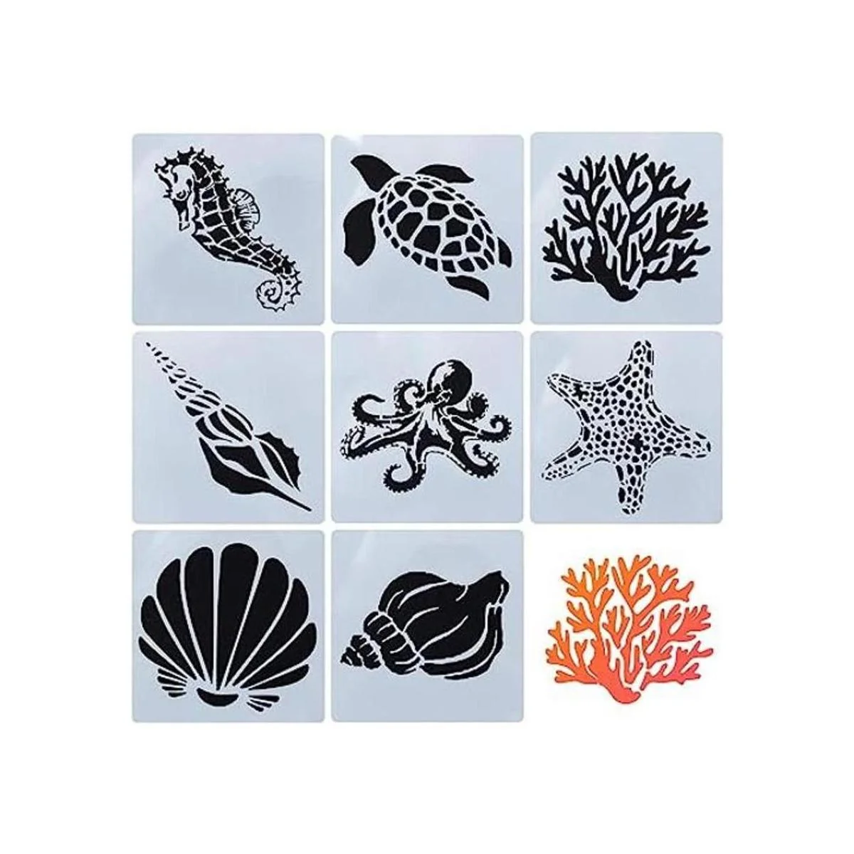 GORGECRAFT Juego de 8 plantillas mixtas de animales marinos, 5.1 x 5.1 pulgadas, plantillas de pintura de criaturas oceánicas para manualidades, álbumes de recortes estrellas de mar, concha, caballito de mar, coral, diseños de conchas