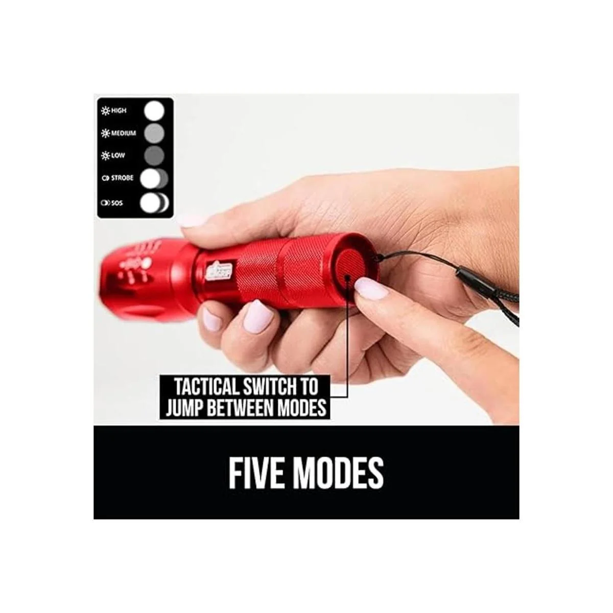 Cinco modos: incluye un botón de toque que te permite cambiar fácilmente entre cinco modos; alto, medio, bajo, estroboscópico y SOS; toca ligeramente el botón para saltar entre los modos, o presiona firmemente el botón para encender o apagar rápidamente sin tener que pasar por cada ajuste