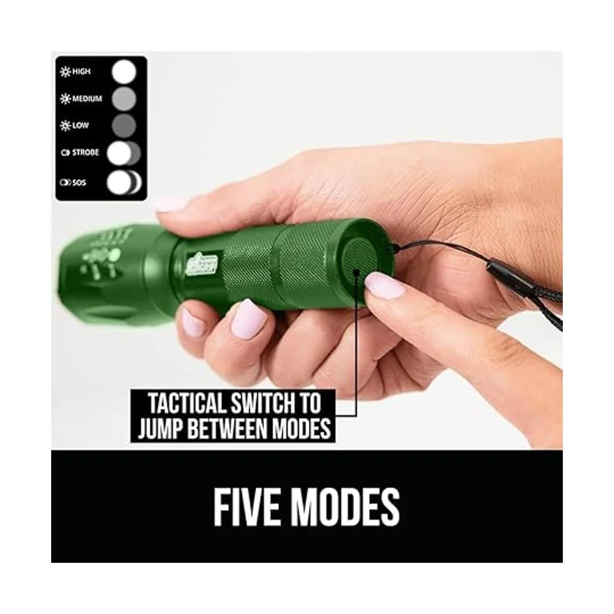 Cinco modos: incluye un botón de toque que te permite cambiar fácilmente entre cinco modos; alto, medio, bajo, estroboscópico y SOS; toca ligeramente el botón para saltar entre los modos, o presiona firmemente el botón para encender o apagar rápidamente sin tener que pasar por cada ajuste