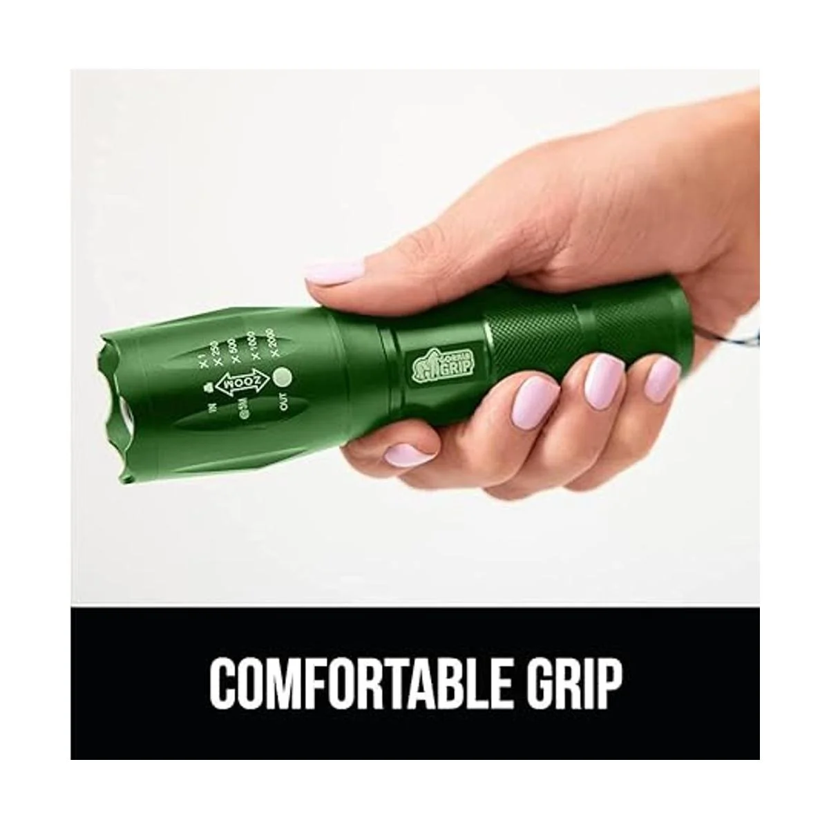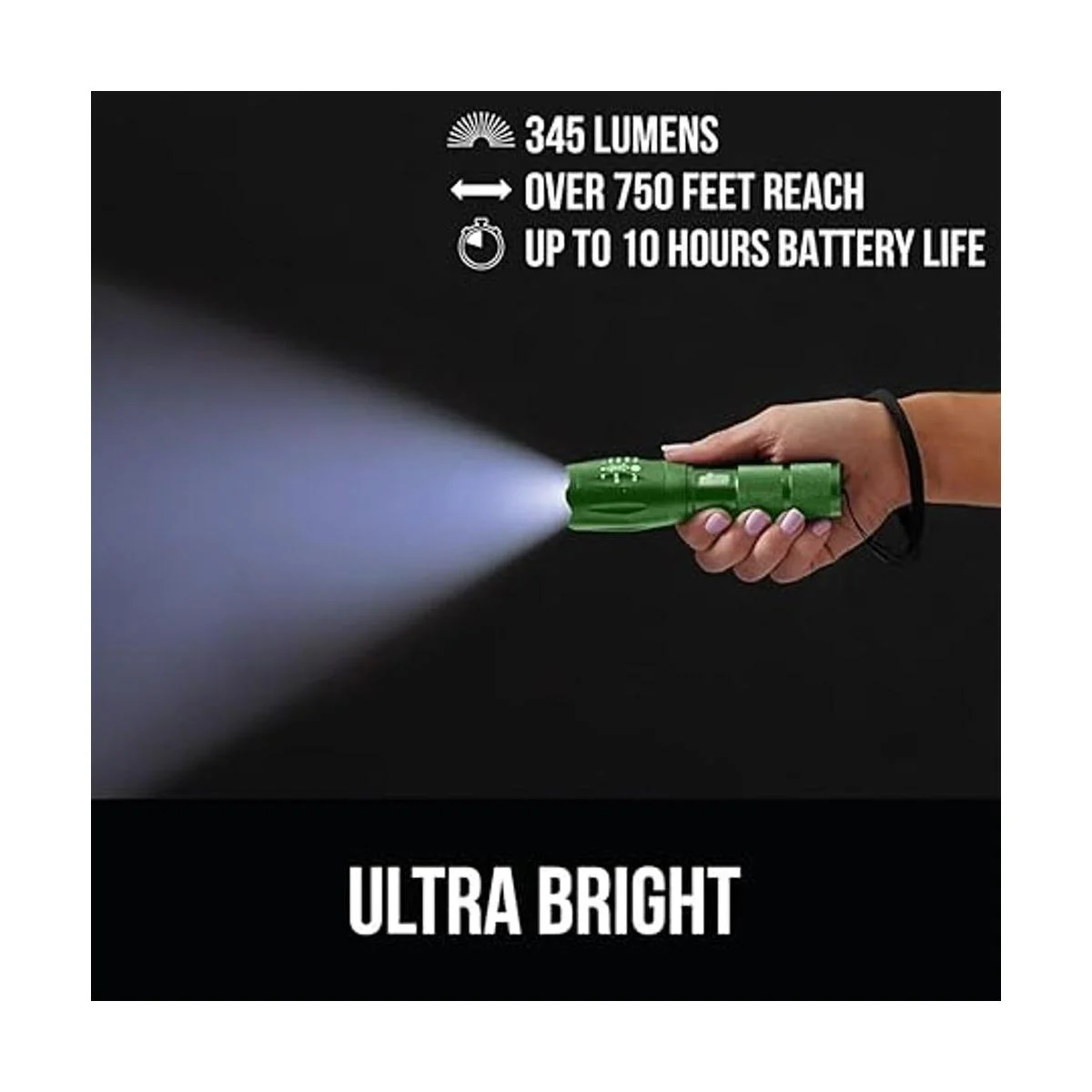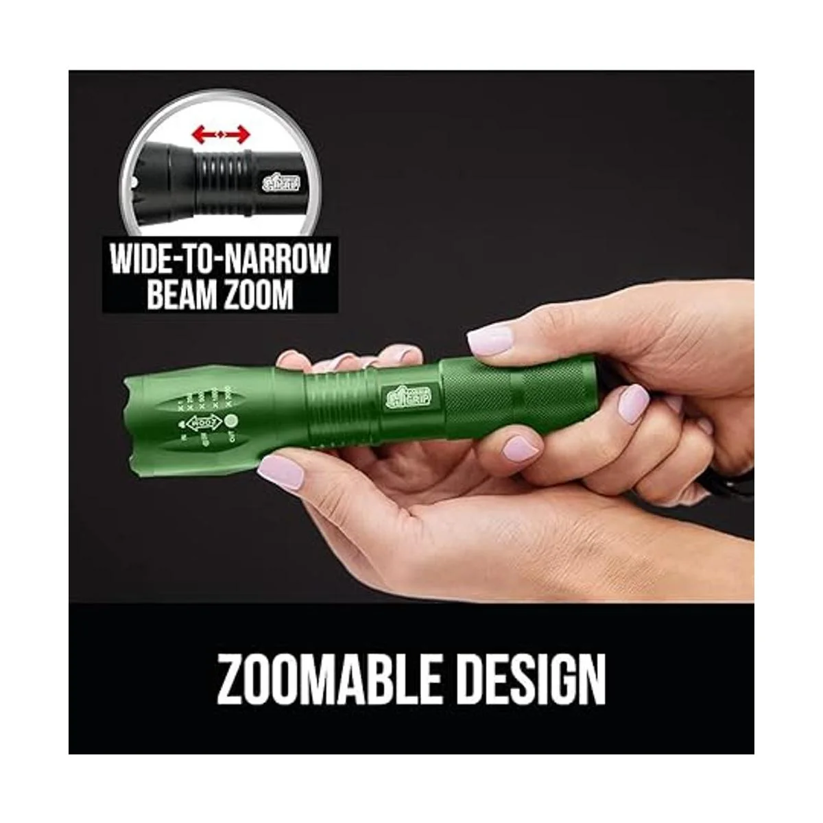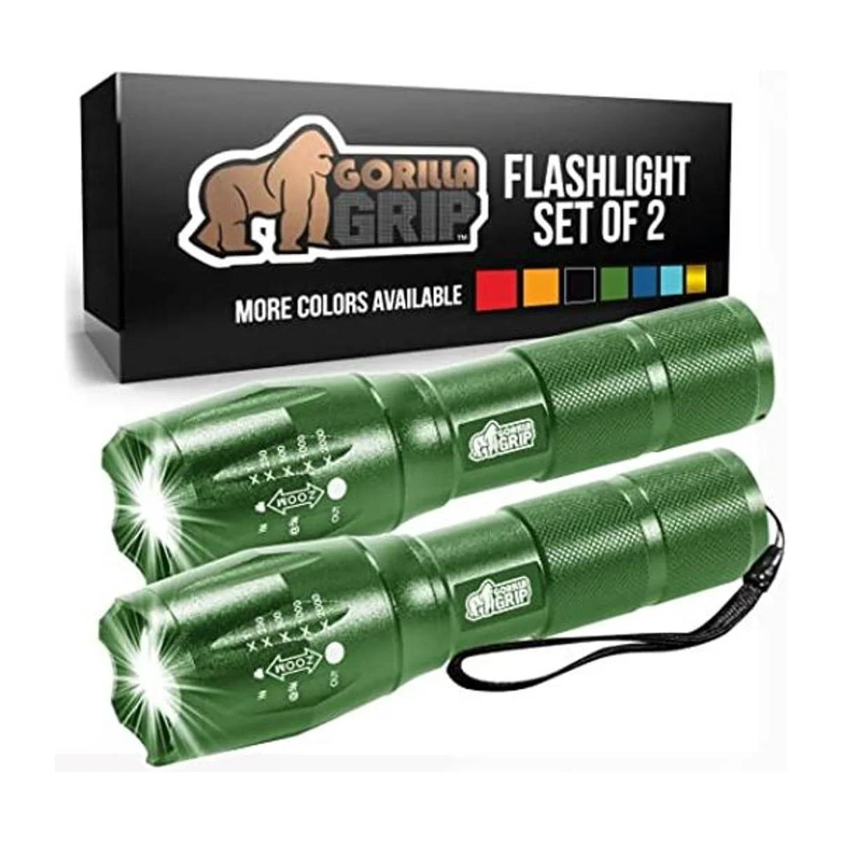 Gorilla Grip Paquete de 2 linternas tácticas LED de mano, altos lúmenes, ultra brillantes, 5 modos, resistente al agua de larga duración, linternas de zoom de 750 pies, accesorio de campamento, equipo de campamento al aire libre, emergencias, verde
