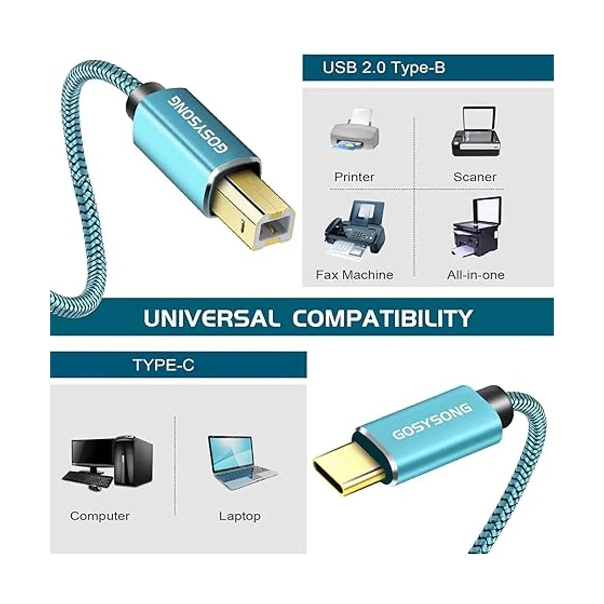 Cable de impresora USB 2.0: el cable de impresora USB C GOSYSONG es ideal para conectar la impresora, escáner, fax, panio, dispositivo MIDI, teclado electrónico y otros dispositivos USB tipo C a laptop, computadora Mac/PC u otro dispositivo habilitado para USB C para transferencia de datos Nota: el smartphone o tableta USB C necesita utilizar dispositivos OTG como intermediarios de transporte