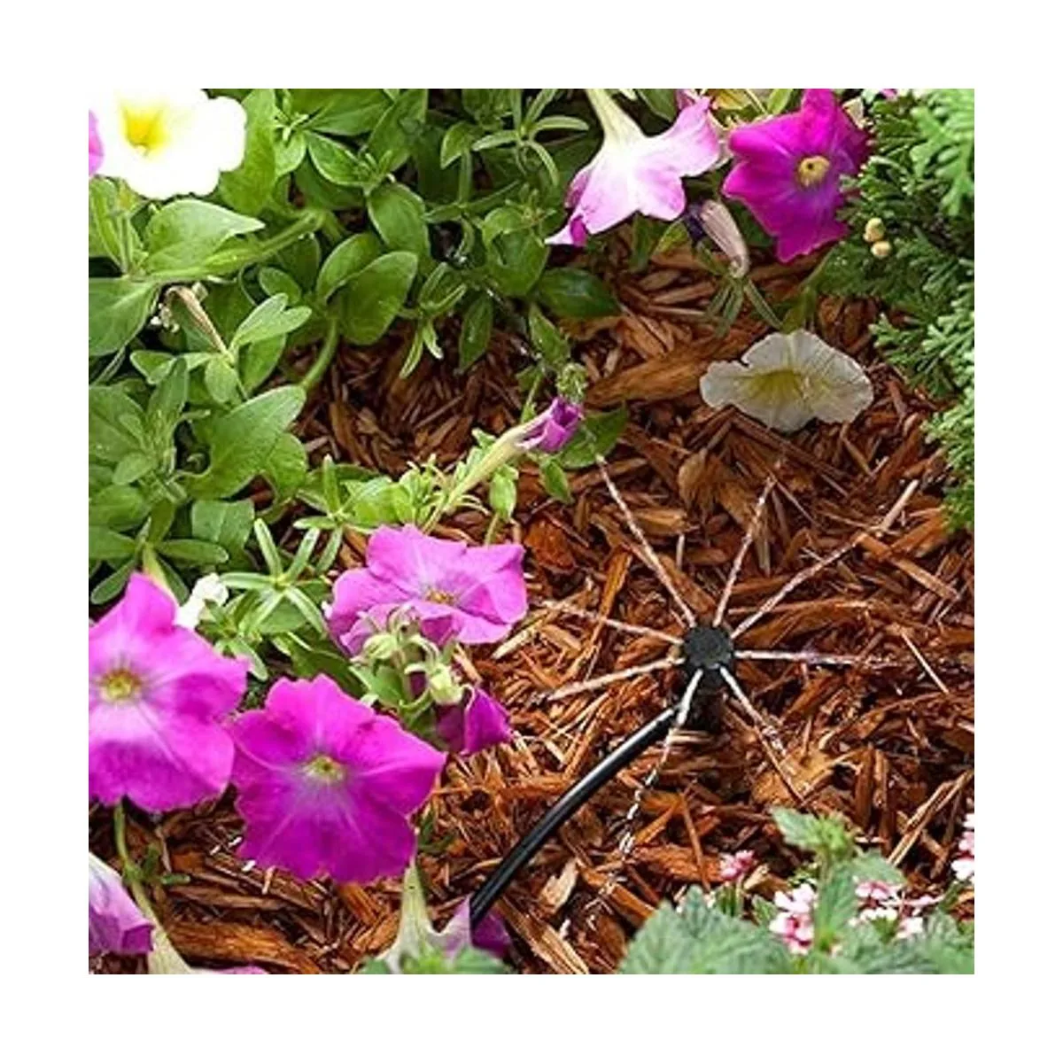 Tamaño de los goteros de riego: longitud total: 5.2 pulgadas; diámetro del agujero de salida de agua: 0.04 pulgadas. ngulo de riego: 360 grados. Adecuado para tubos de 4/0.276 in diámetro interior/exterior. Cada gotero tiene 8 agujeros de salida en la parte superior.