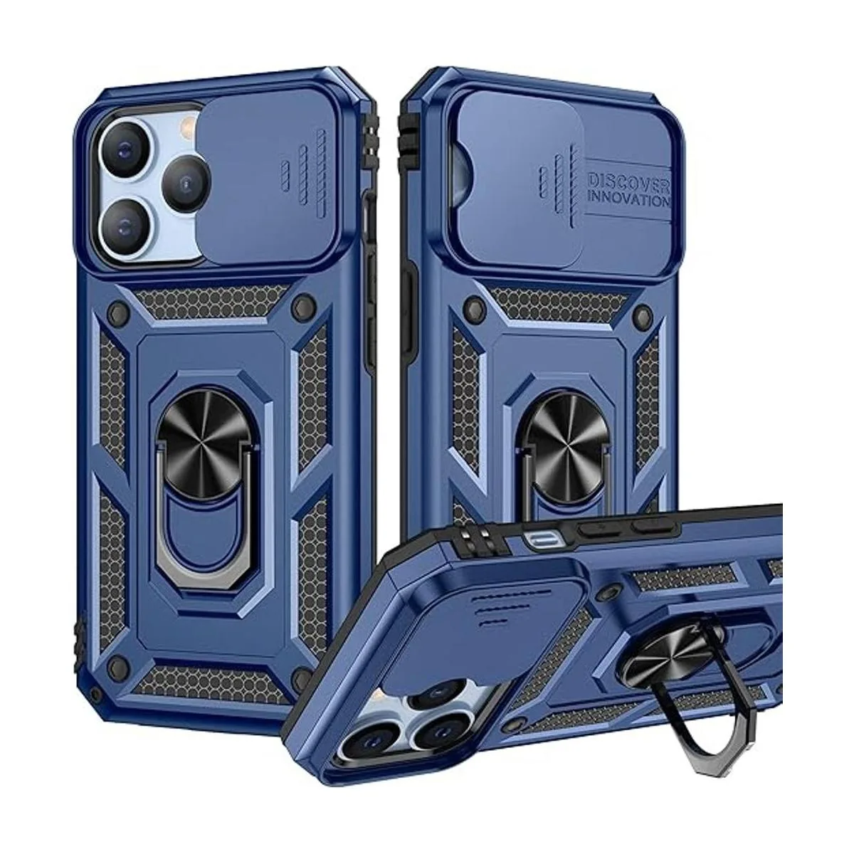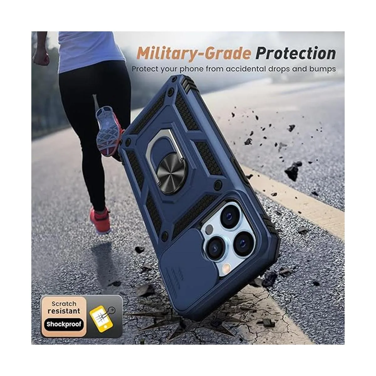 Goton Armor Funda para iPhone 13 Pro con cubierta de cámara deslizante y soporte de soporte, resistente funda de protección de grado militar, soporte integrado de anillo giratorio de 360, funda resistente a prueba de golpes de cuerpo completo azul