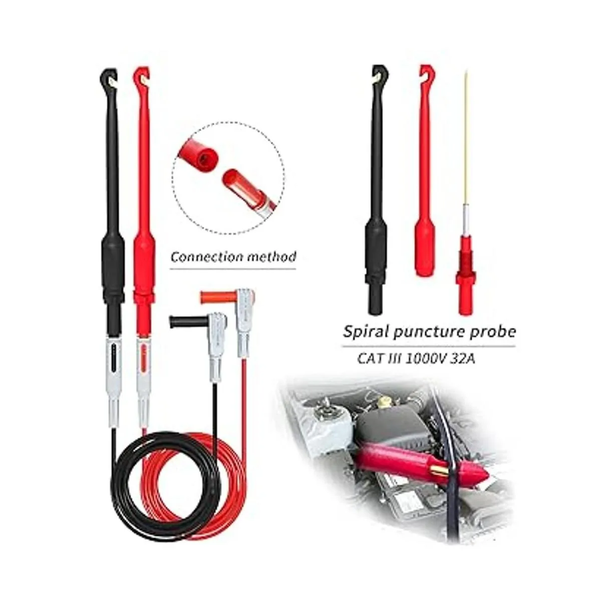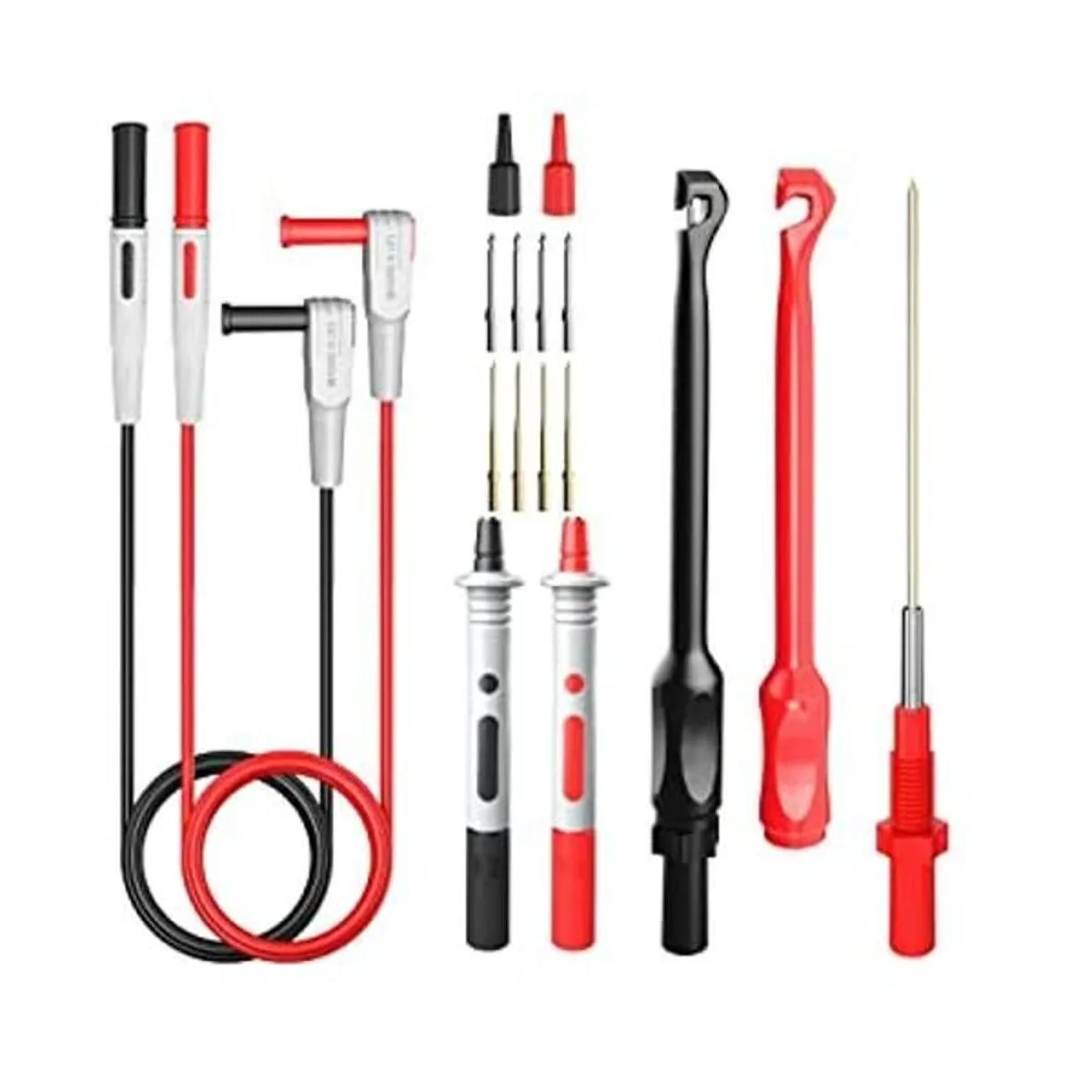 El paquete incluye: 2 cables de prueba de multímetro macho a macho de 0.157 in, 2 sondas de perforación de alambre rojas negras, juego de 8 sondas reemplazables.