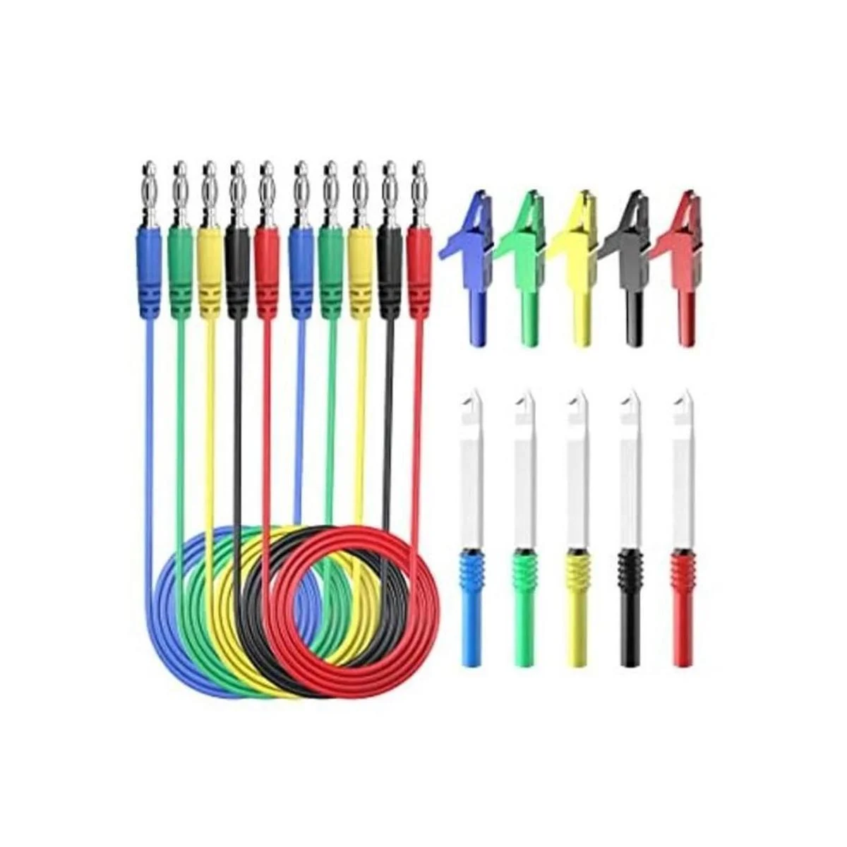 El paquete incluye: 5 cables de prueba de enchufe banana a banana, 5 clips de cocodrilo, 5 sondas de perforación de alambre de aislamiento, 1 caja de almacenamiento transparente blanca.