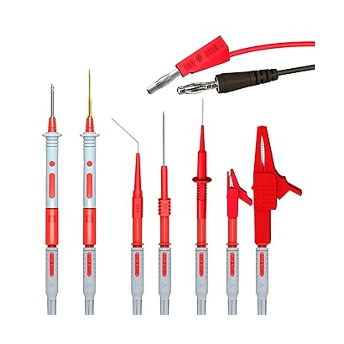 El paquete incluye: 5 cables de prueba de plátano a cocodrilo, 2 cables de prueba de multímetro de plátano macho a macho de 0.157 in, 8 sondas reemplazables, 2 cables de gancho de plátano a mini agarre, 15 sondas traseras, 2 agujas cortas de resorte interior, 2 clips de cocodrilo aislados, 2 abrazaderas de cocodrilo resistentes, 2 sondas de perforación de aislamiento, un paquete plegado de seis posiciones de ajuste.