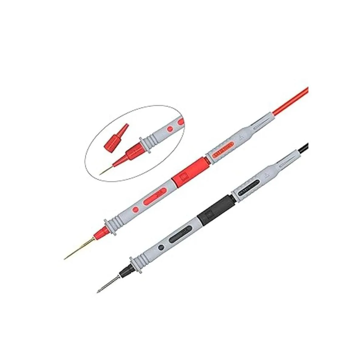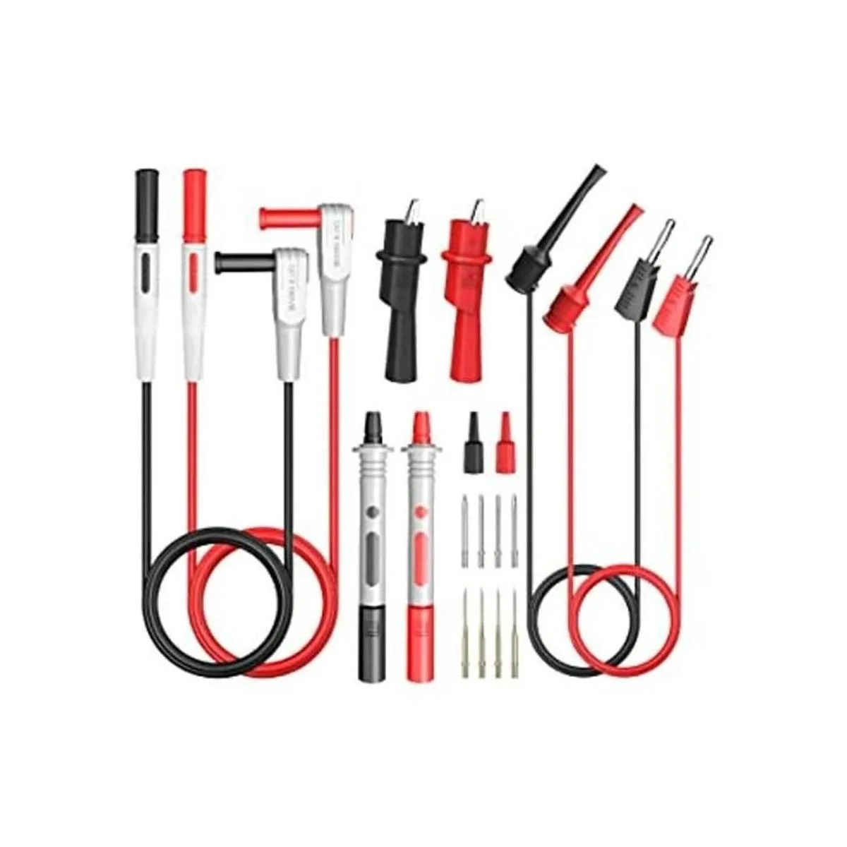 El paquete incluye: 2 cables de multímetro, 8 sondas reemplazables, 2 clips de cocodrilo a presión, 2 conectores banana a clip de gancho de prueba de minigrabber cables suaves.