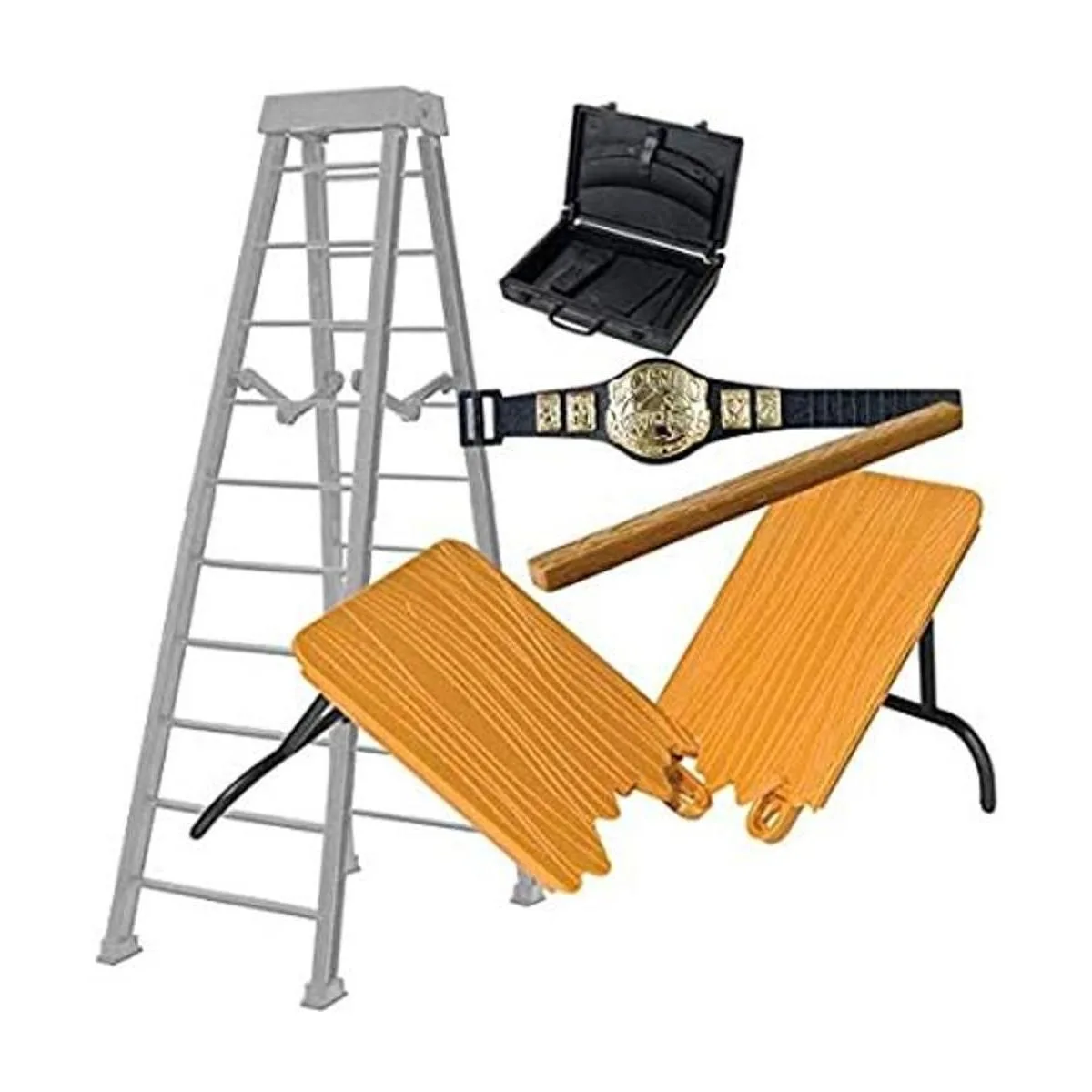 Cuenta con los siguientes 5 artículos: 1 escalera de 10.0 in, 1 cinturón de figura de acción de campeonato, 1 palo de 2 x 4, 1 maletín y 1 mesa de separación marrón