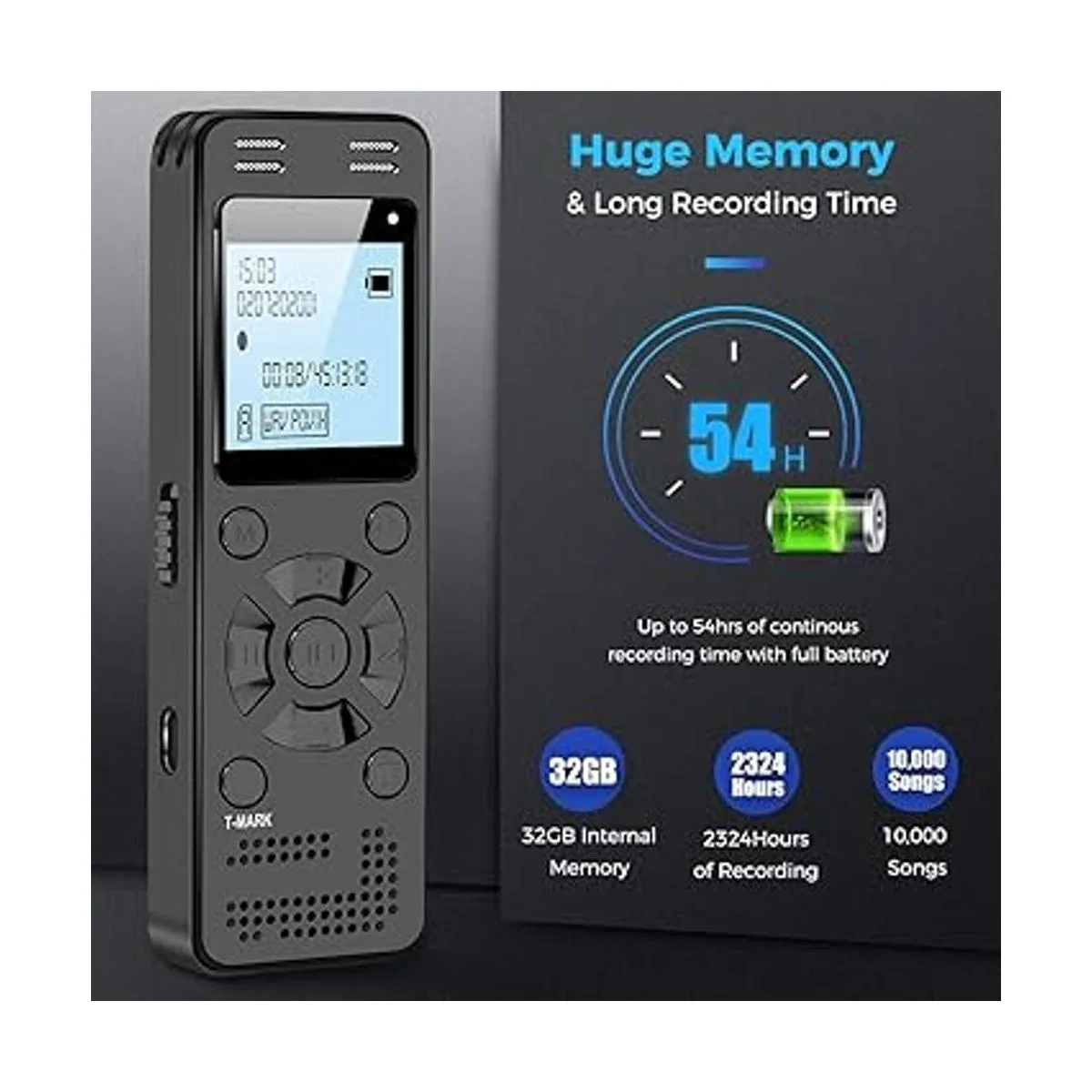 Grabadora digital de 32 GB: almacena 2324 horas de grabación, o 10.000 canciones, hasta 54 horas de grabación continua con batería completa. La grabación se puede preconfigurar en formato MP3 de 128 kbps, 192 kbps o wav de 1536 kbps. Un maravilloso dispositivo de grabación de voz para conferencias, reuniones y conversaciones.
