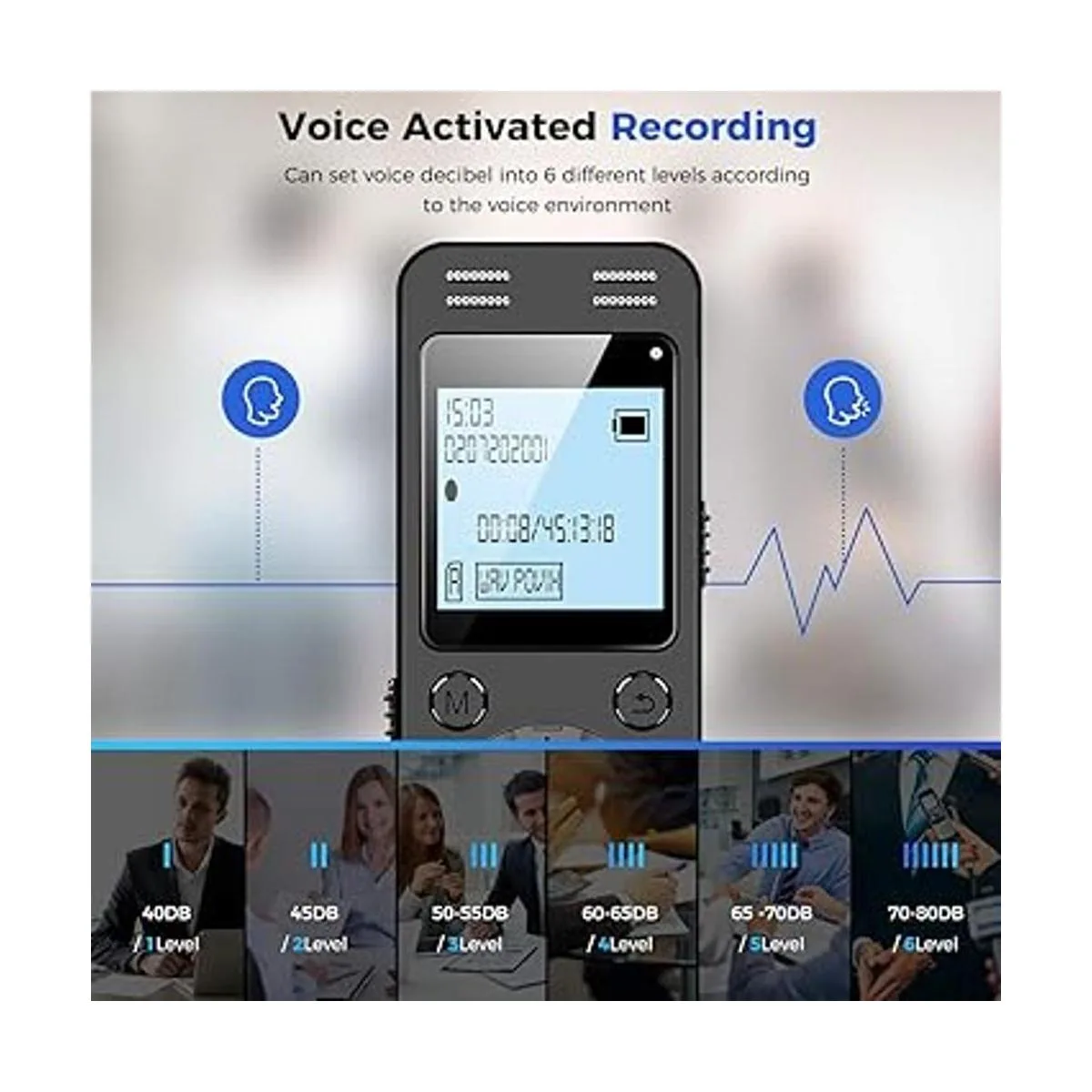 Grabadora activada por voz: Este mini dispositivo de grabación puede establecer decibelios de voz a 6 niveles diferentes. Independientemente del nivel del volumen, con el nivel de decibelios de voz correcto, esta grabadora captará la voz hablando solamente, reducirá el corte en blanco y susurrante.