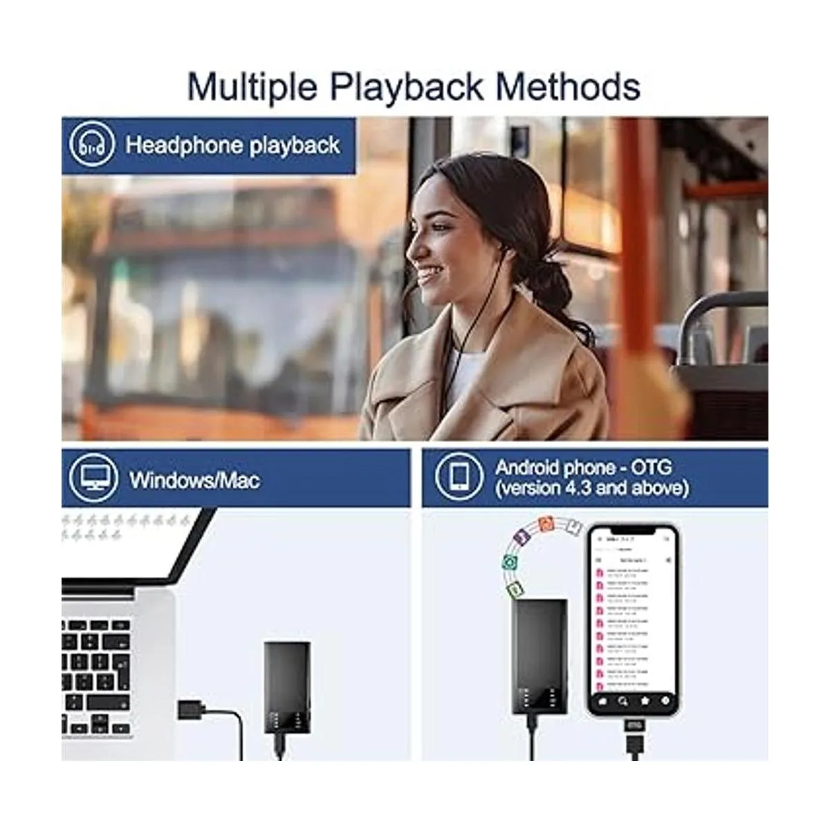 Reproducción de grabación: todas las grabaciones se pueden reproducir en computadora, teléfono inteligente utilizando OTG o auriculares. Si encuentras que las grabaciones no se pueden leer en la computadora, haz clic en cualquiera de las grabaciones, elige el reproductor predeterminado de tu computadora para reproducir grabaciones. Aplicar a entrevistas, reuniones, clases, conciertos, etc. Ideal para cualquier persona que ama grabar algo en tu vida, o esa miel con dificultades de memoria