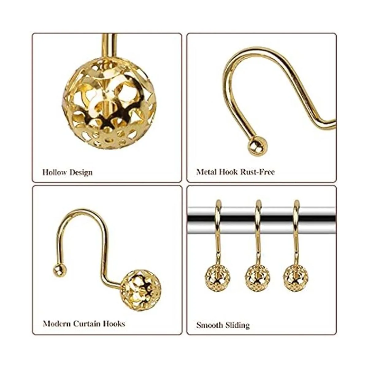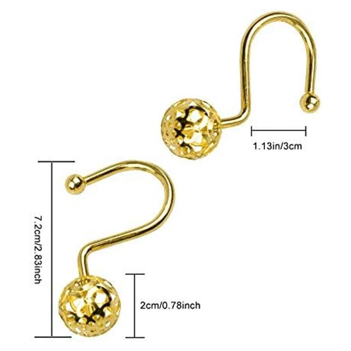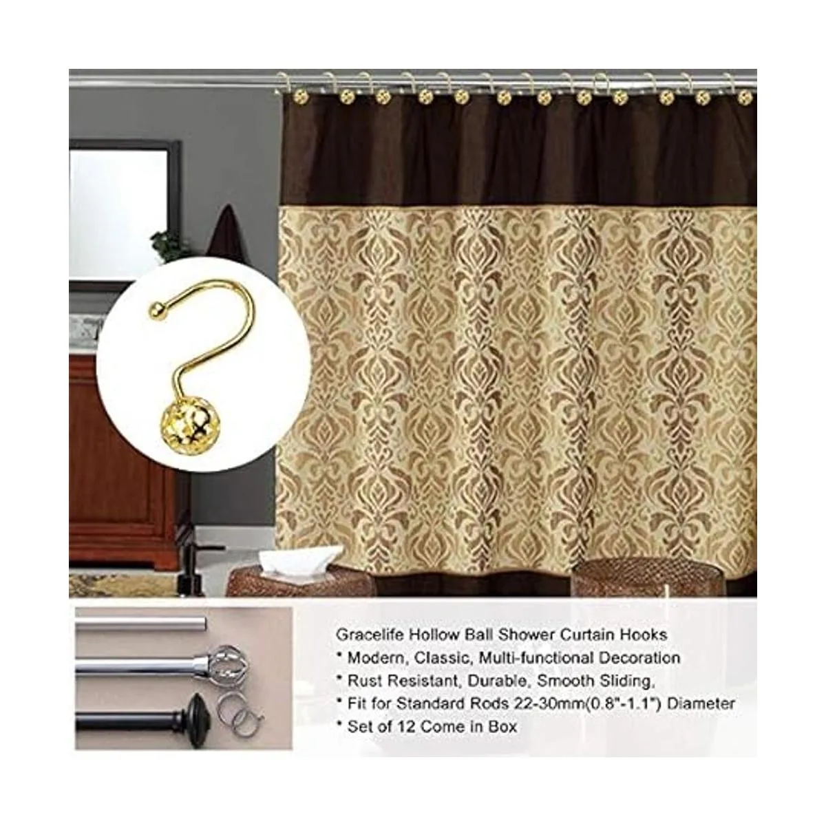 Gracelife 12 ganchos de cortina de ducha de bola hueca de lujo, de acero inoxidable, resistentes al óxido, ganchos para cortina de ducha para barra de baño dorado