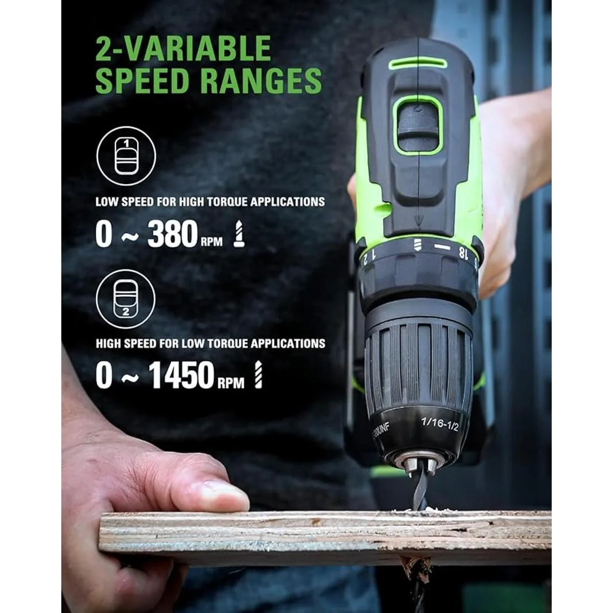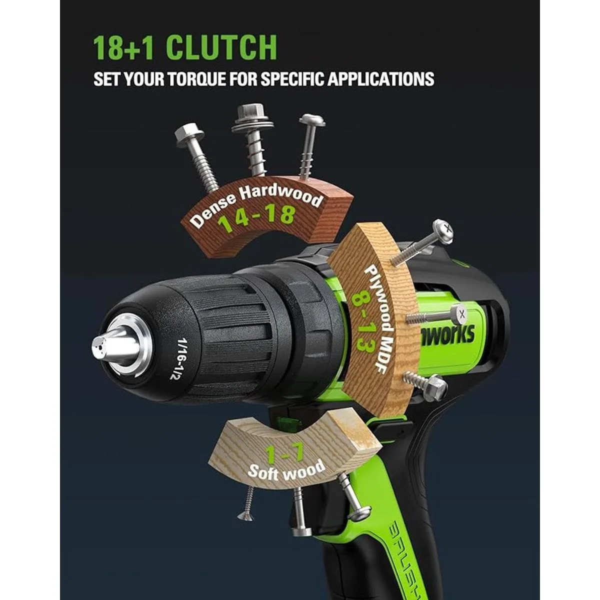 0.5 in. Controlador de taladro: compacto y ligero, transmisión de 2 velocidades 0380RPM/01450RPM, par de torsión de 310 pulgadaslibras 35Nm, embrague de 18 más 1 posición con 1/2 pulgada. El portabrocas sin llave ofrece un mejor ajuste de torsión para taladrar agujeros y tornillos de conducción en una variedad de materiales.