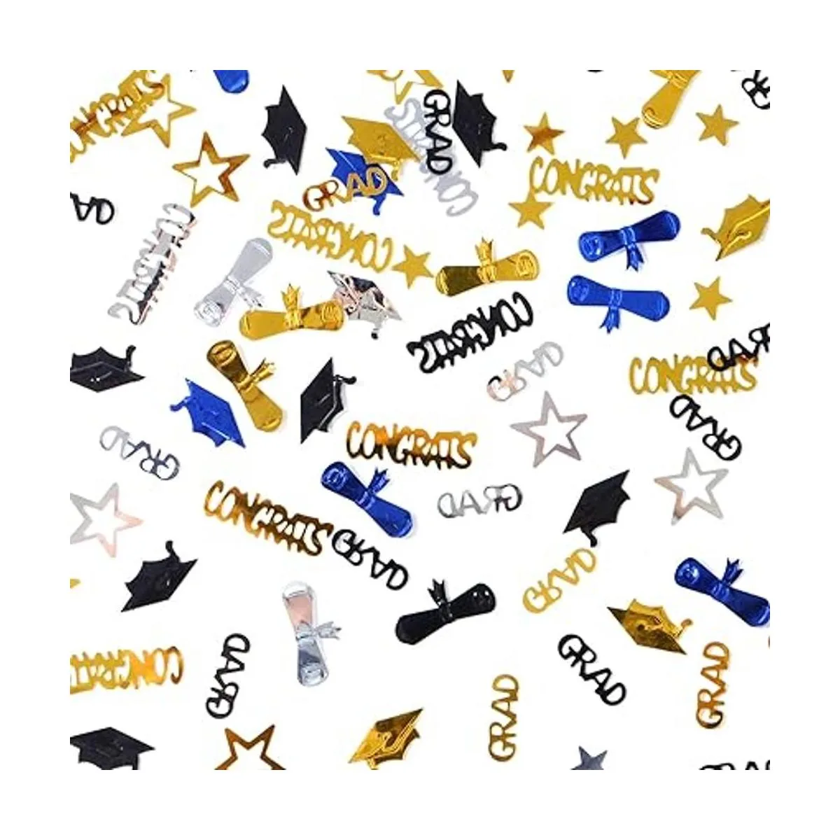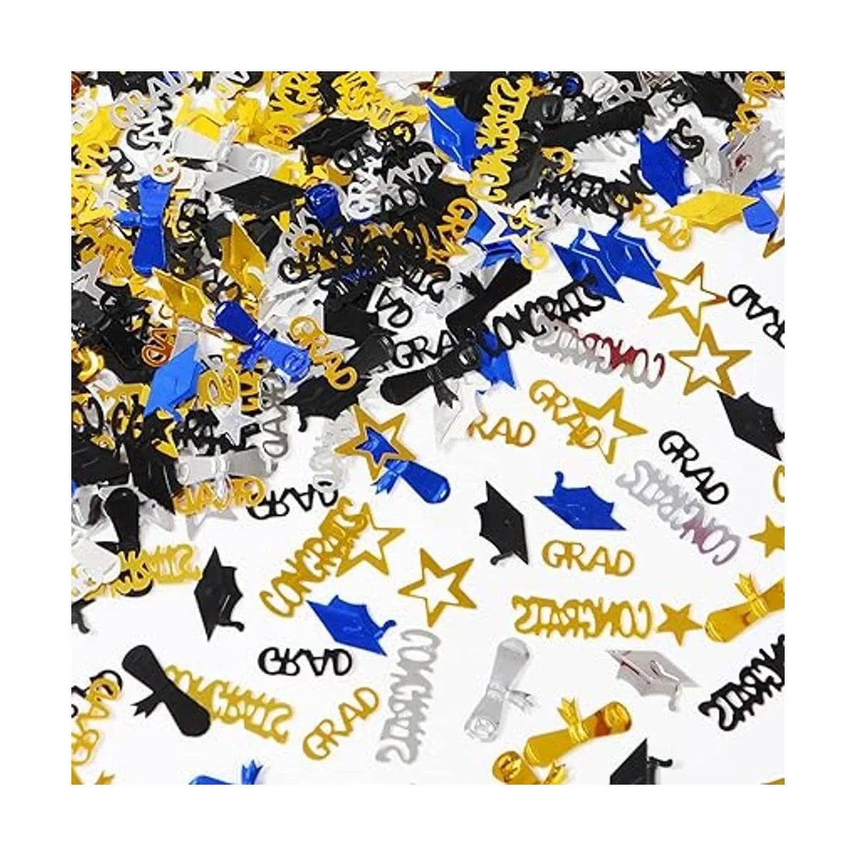 2022 graduation table confetti nicely crafted in navy blue black, silver and gold colors in patterns of Congrats, Grad, Star, Graduation Cap, Diploma.